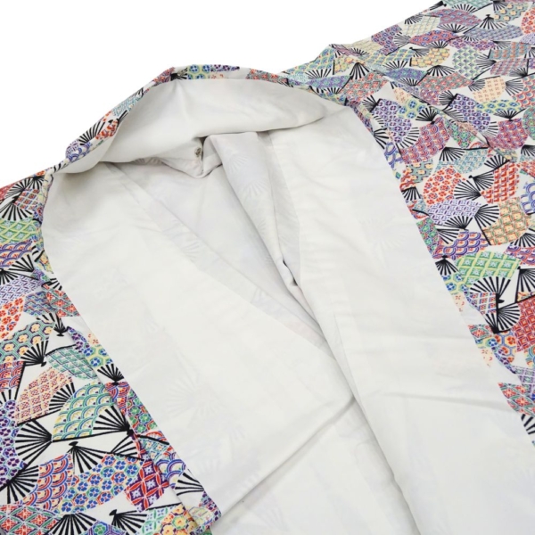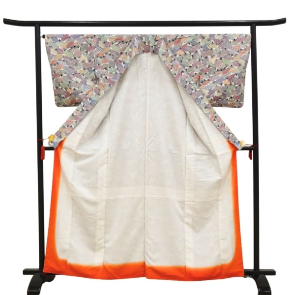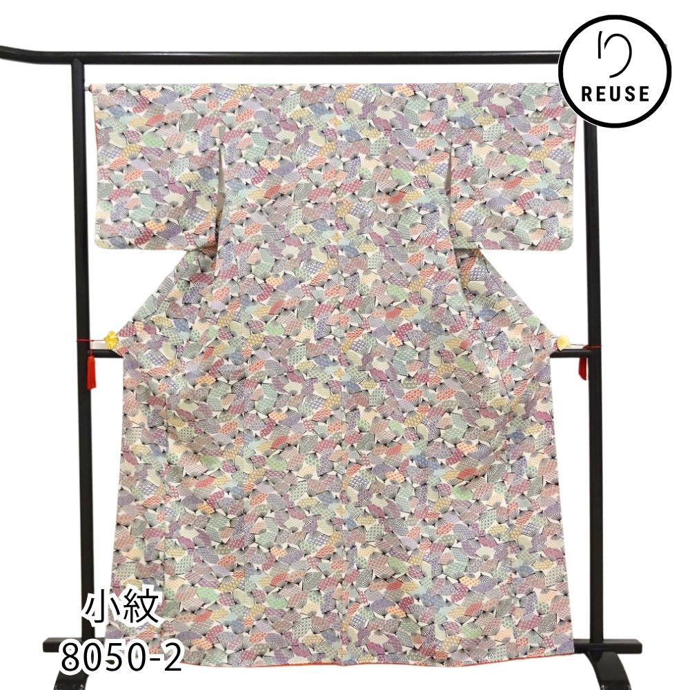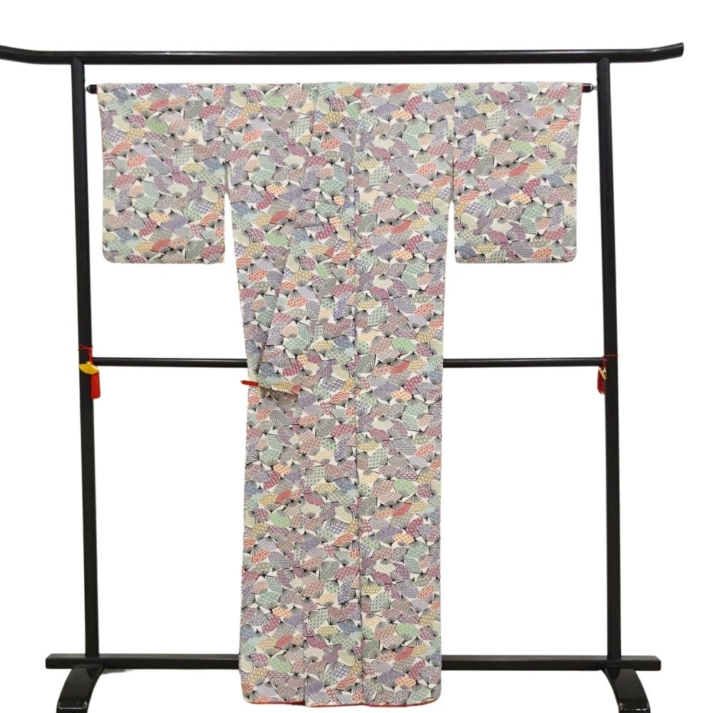 小紋 正絹 リユース 中古 袷 白地 扇面 青海波 鹿の子 8050-2 華やか カジュアル 観劇 お食事会 お出かけ