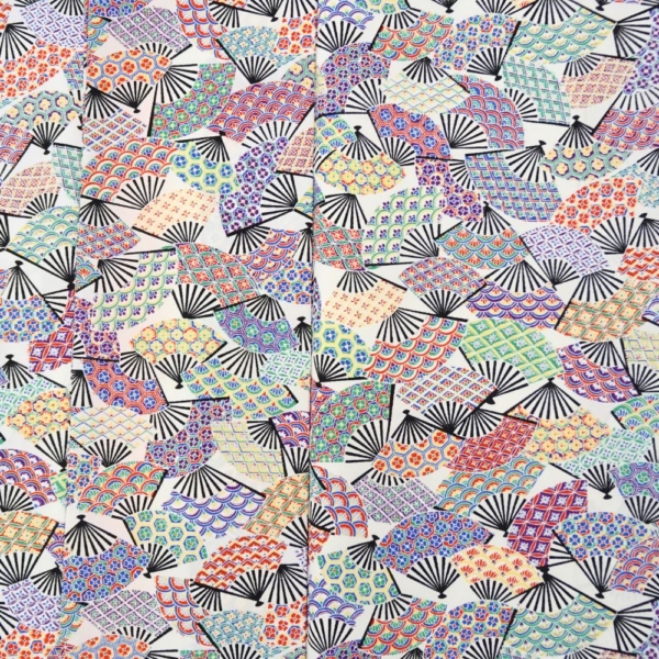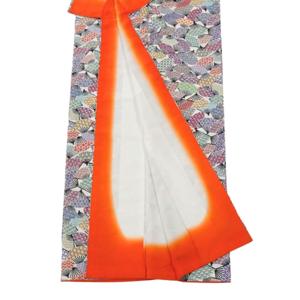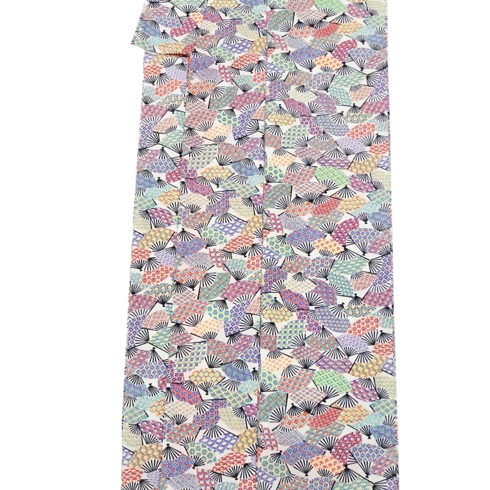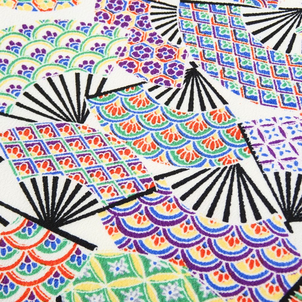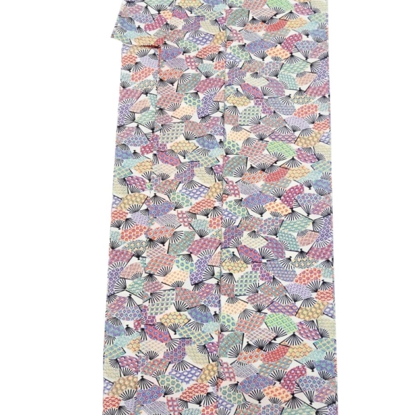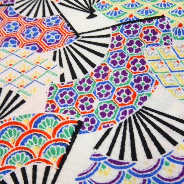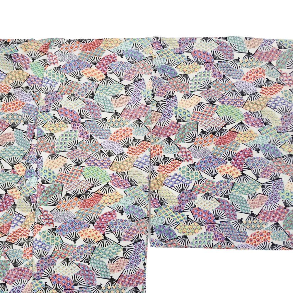 白地に色鮮やかな扇面が舞う、可憐で華やかな正絹の小紋です。