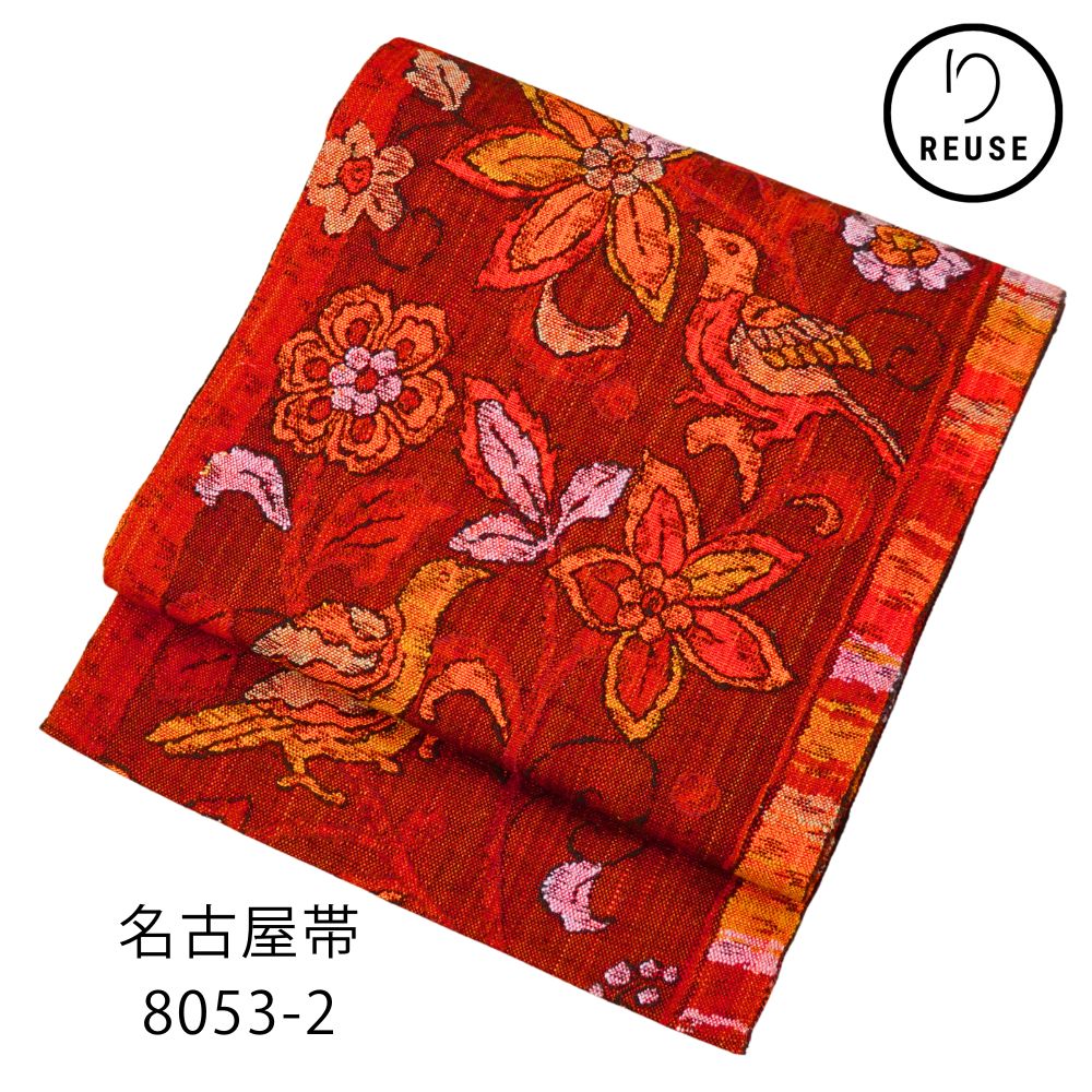名古屋帯 正絹 リユース 中古 赤茶系 花 鳥 吉祥柄 8053-2 カジュアル 小紋 紬 お洒落着