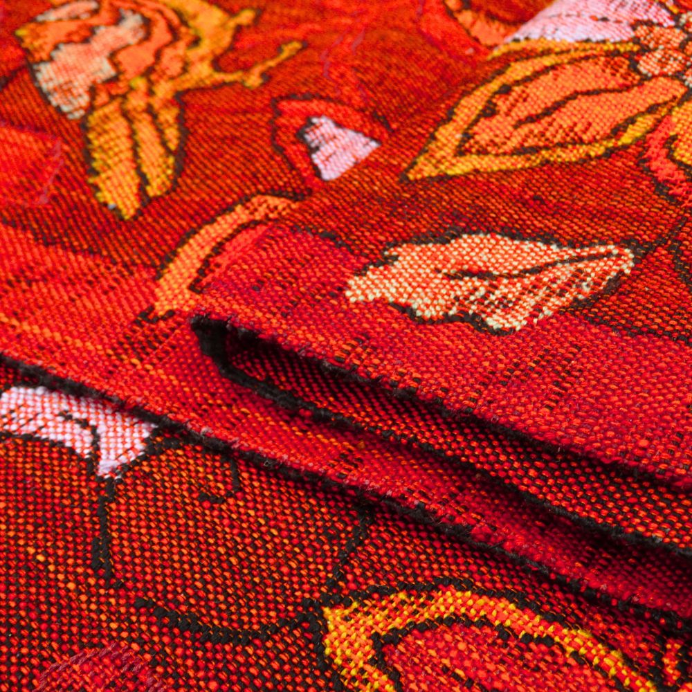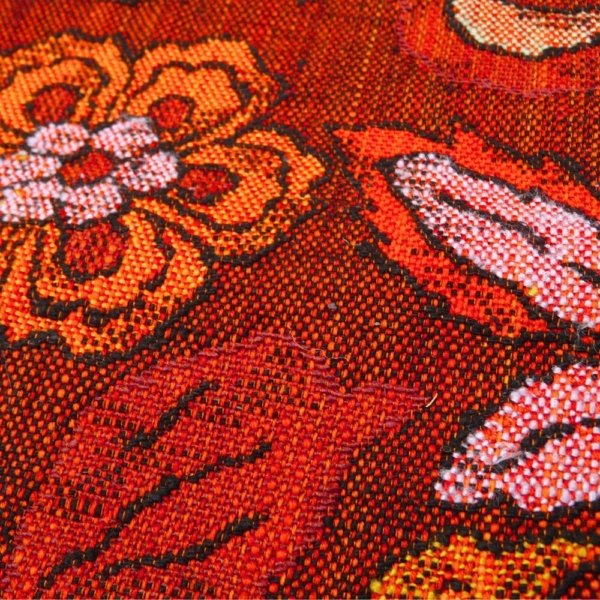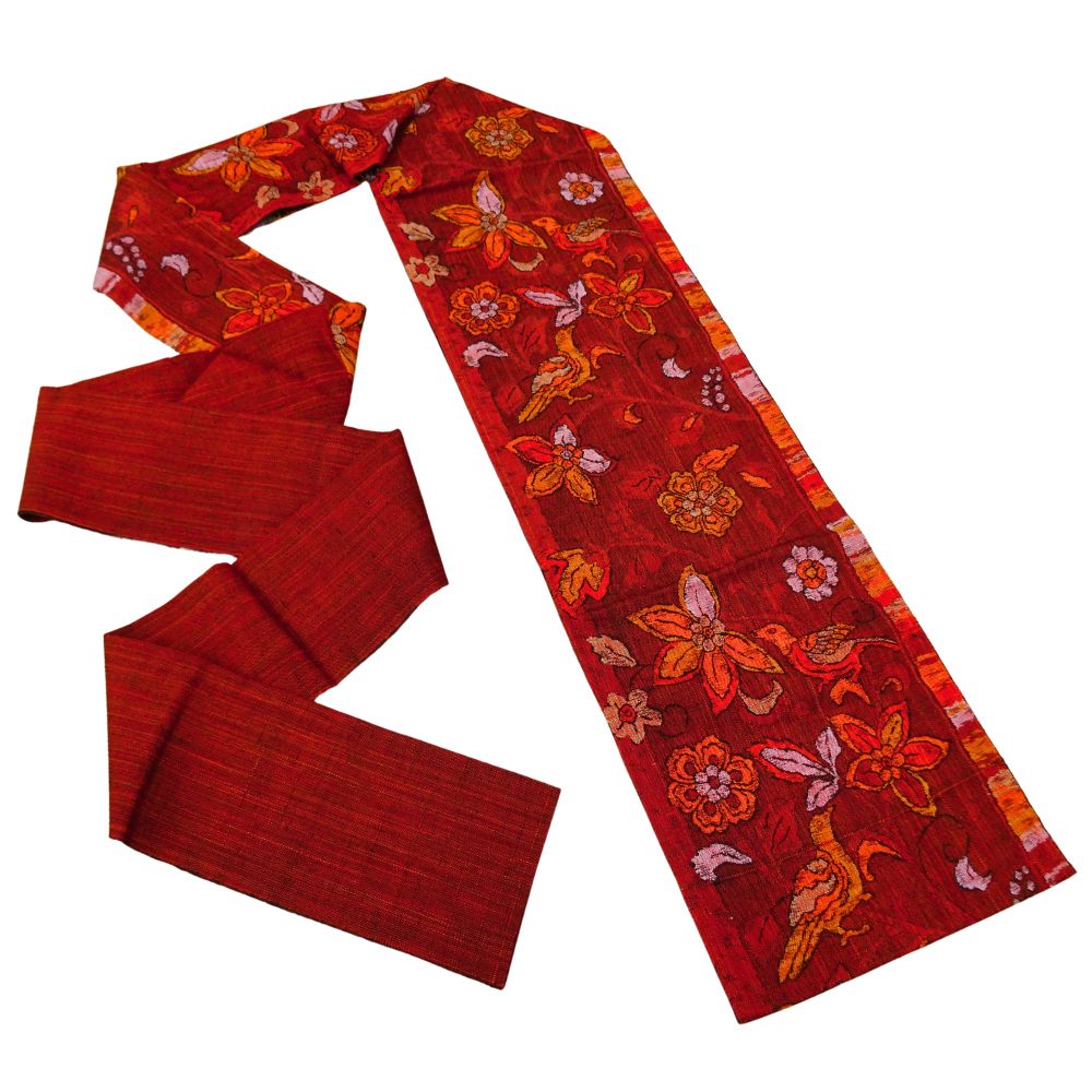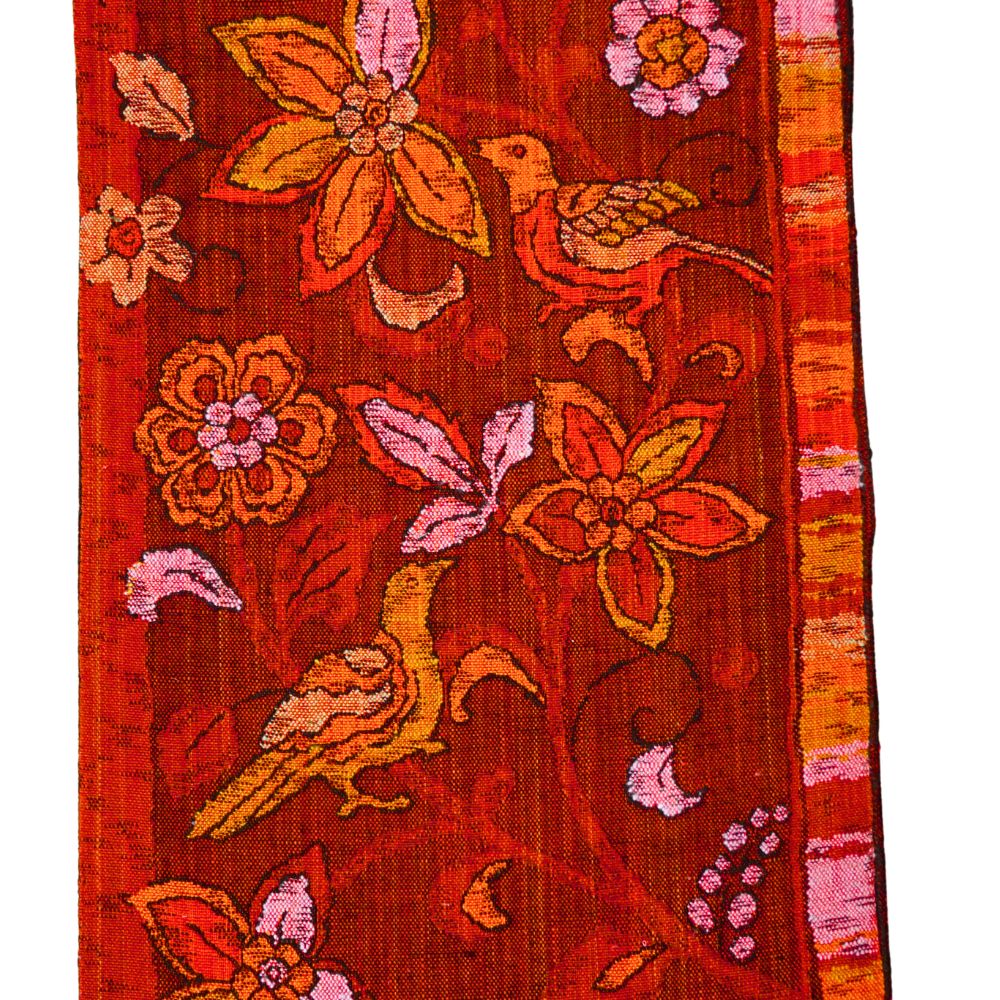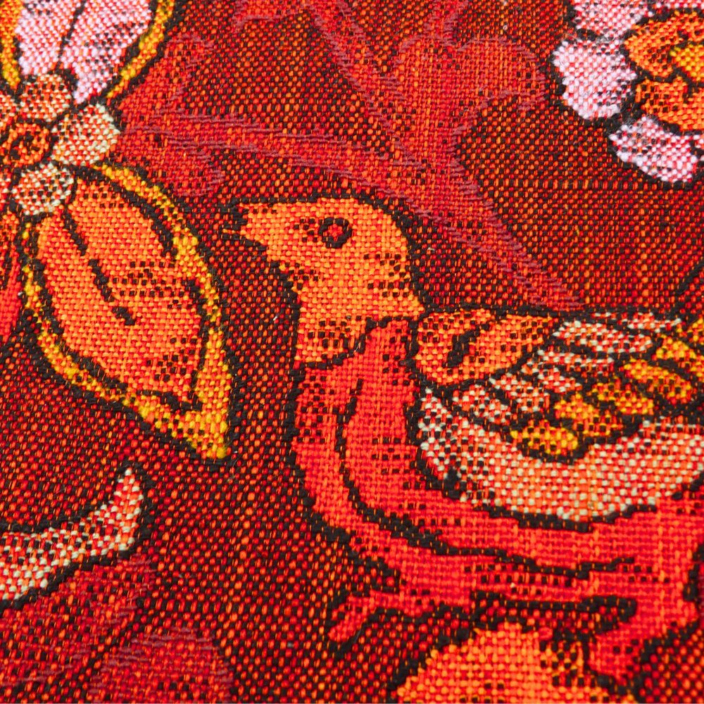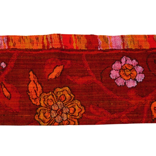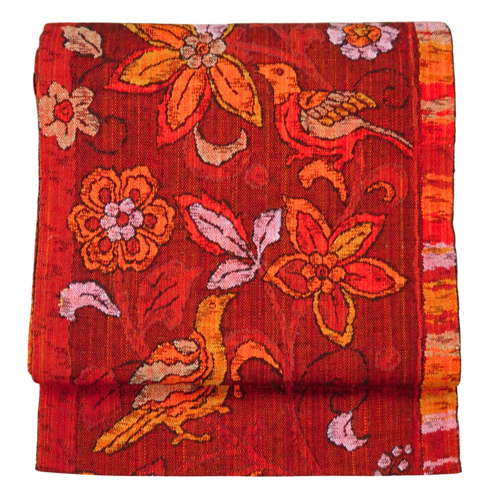 しっとりと落ち着きがありながらも、どこか情熱的な赤茶の地に、緻密な織りで表現された更紗調の花々と、楽しげに羽を休める鳥が印象的な名古屋帯です。