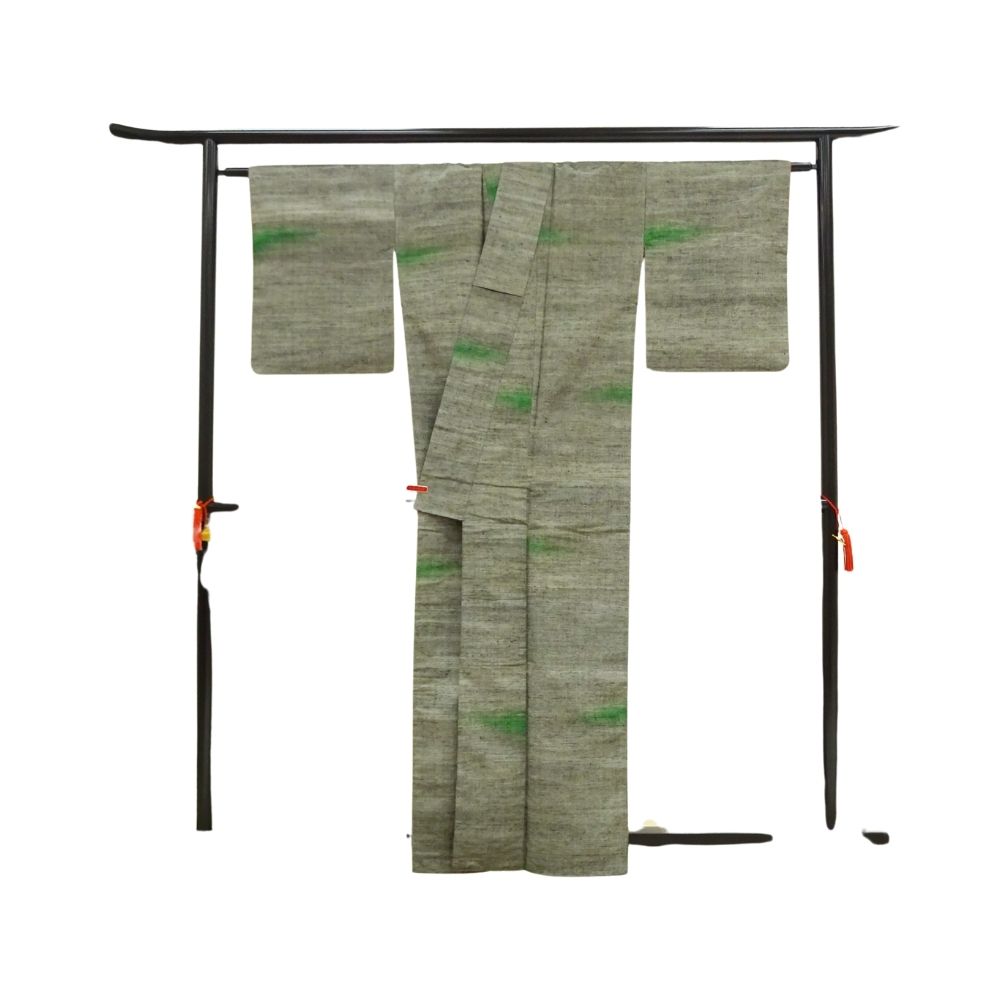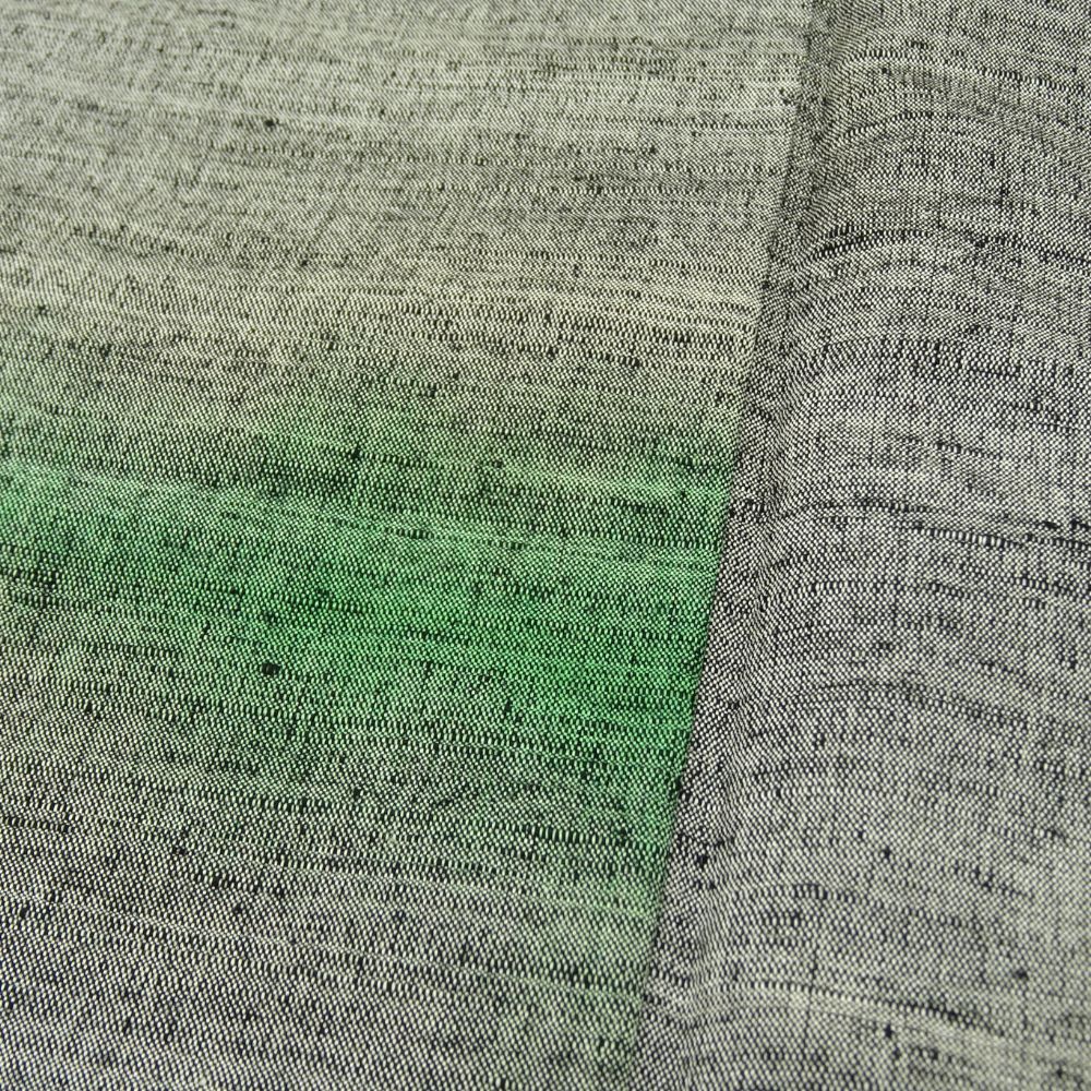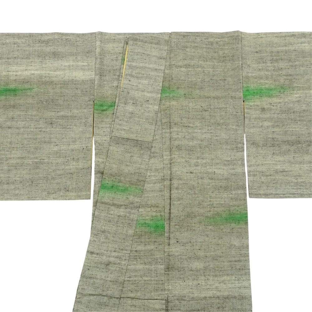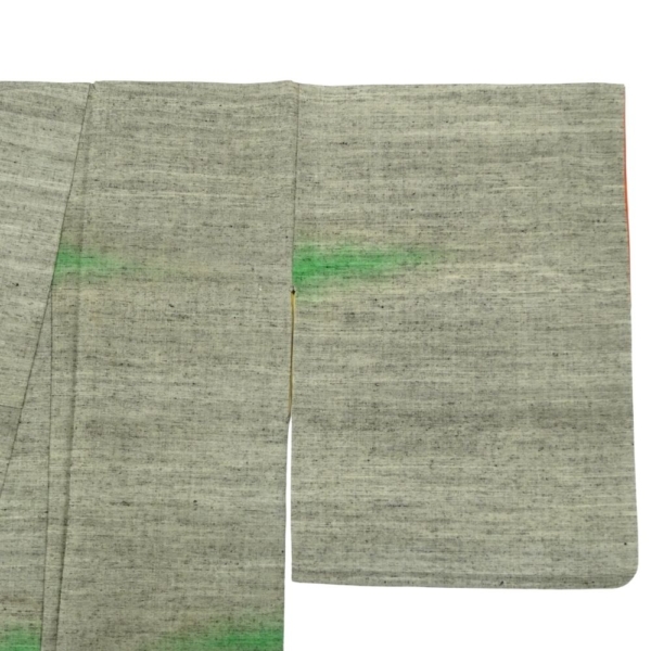 落ち着いたグレーの地色に、筆で引いたようなグリーンの絣模様がモダンなアクセントを添えています。