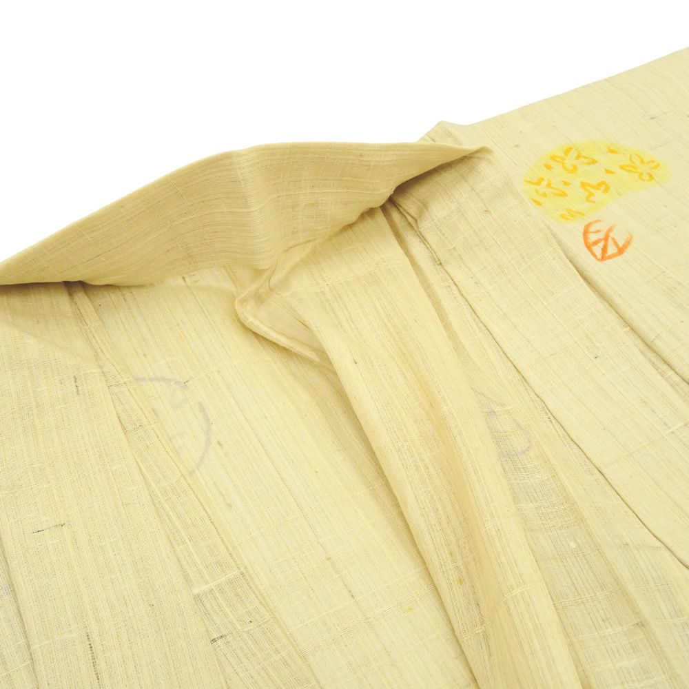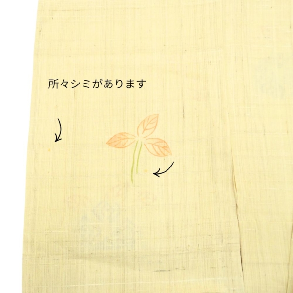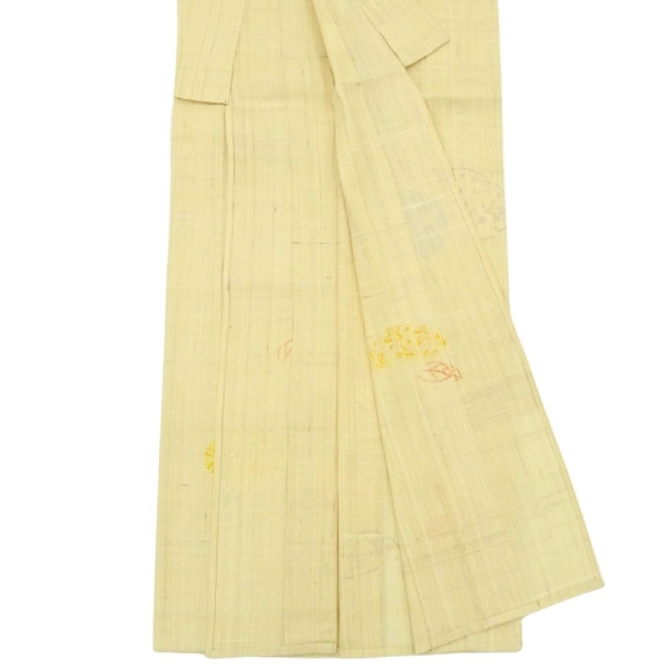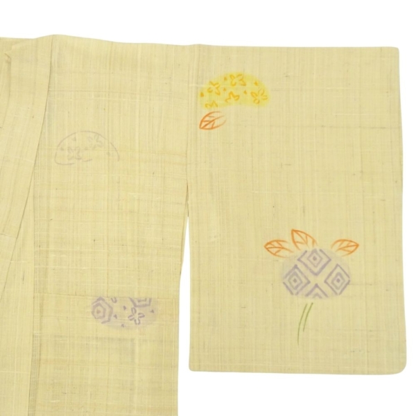 心まで解きほぐされるような、柔らかな生成り(クリーム色)の地に、可憐な花や葉のモチーフを散りばめた正絹の紬です。