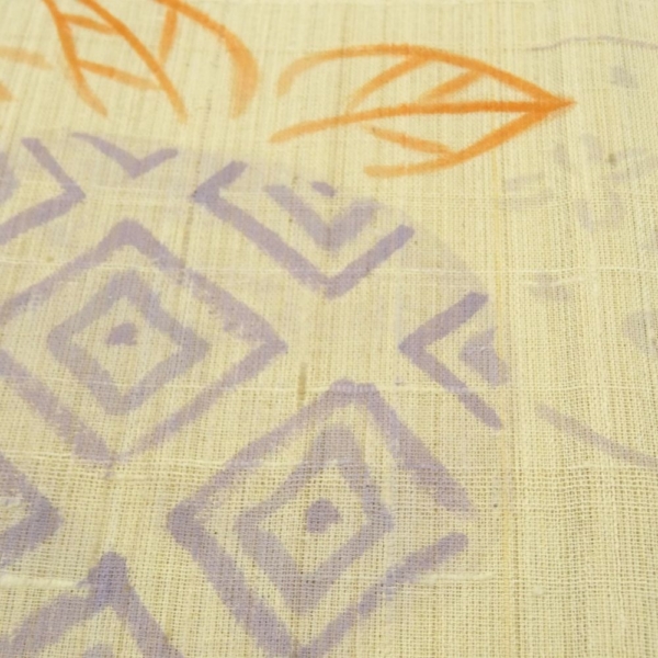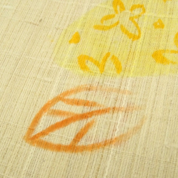 幾何学模様の花や、温かみのあるオレンジ・黄色で描かれた葉の模様が、単調になりがちな無地感の紬に絶妙なリズムと華やかさを添えています。