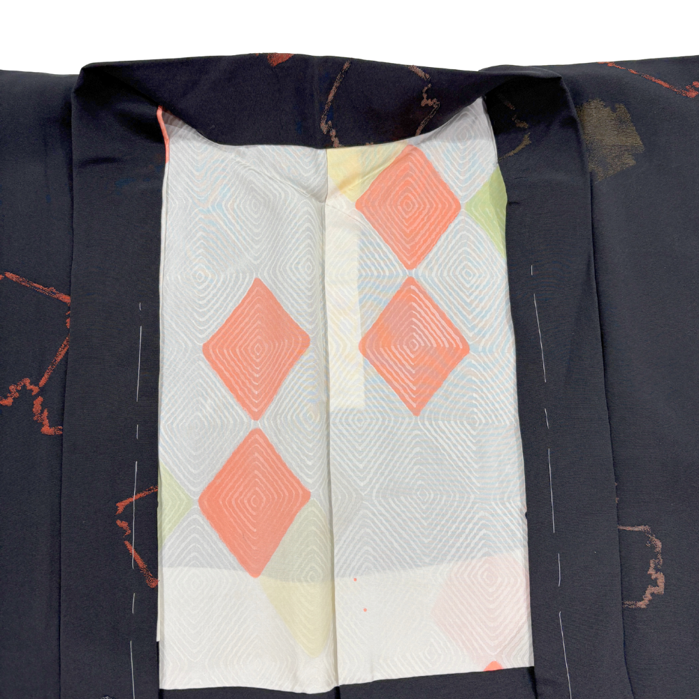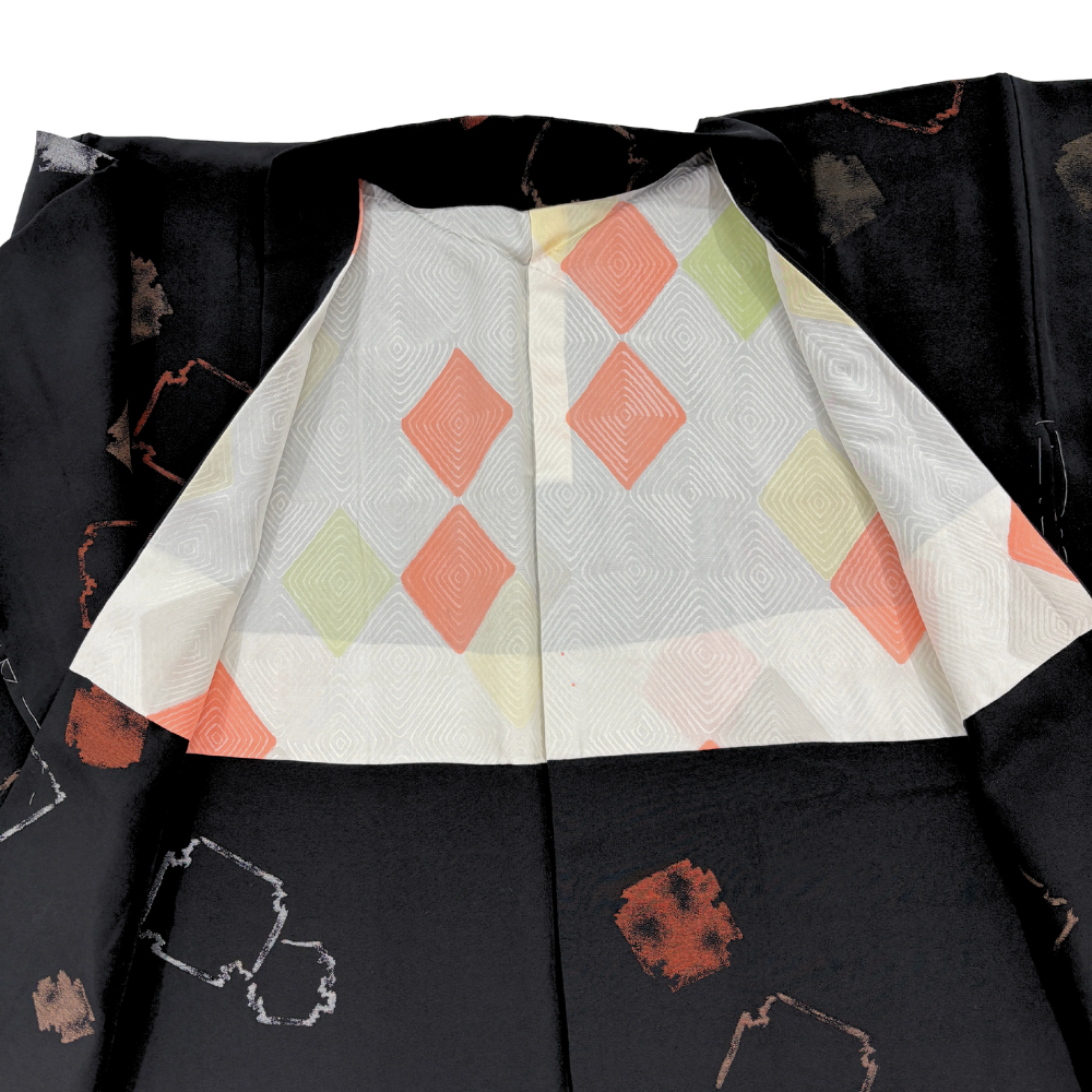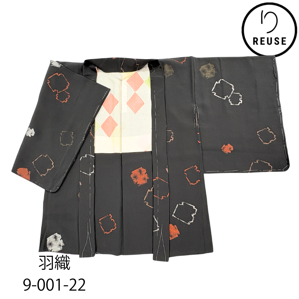 羽織 袷 正絹 リユース 中古 黒地 幾何学抽象紋様 揚羽蝶 一つ紋 9-001-22