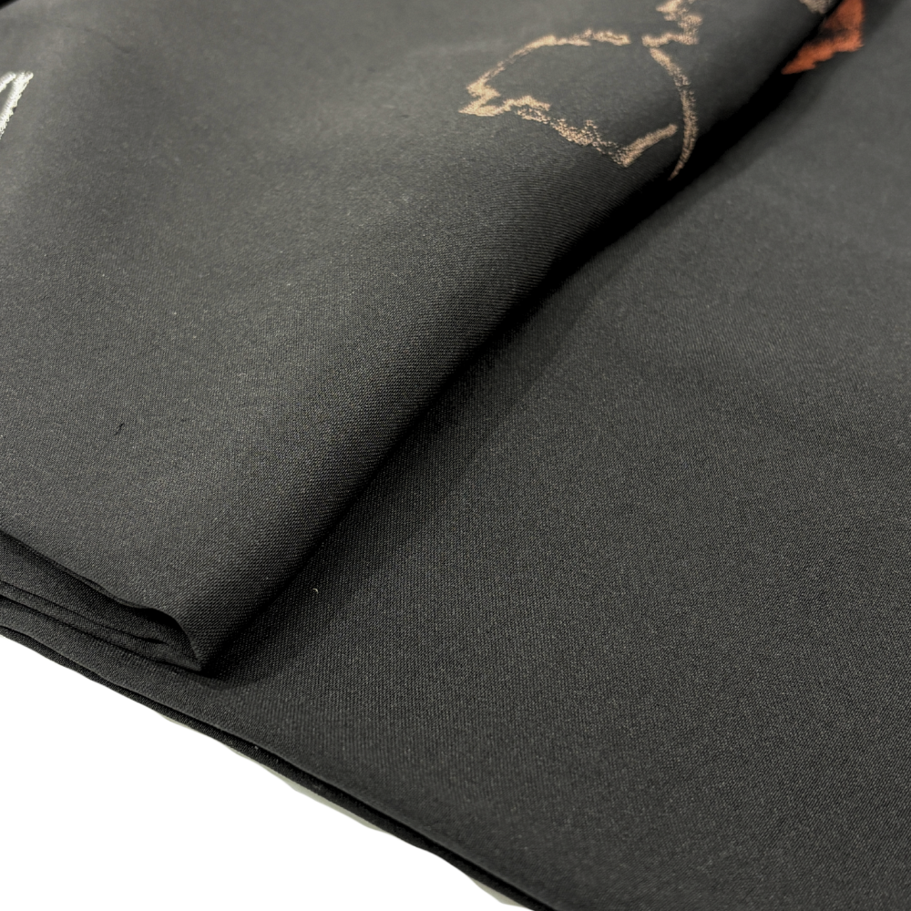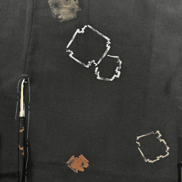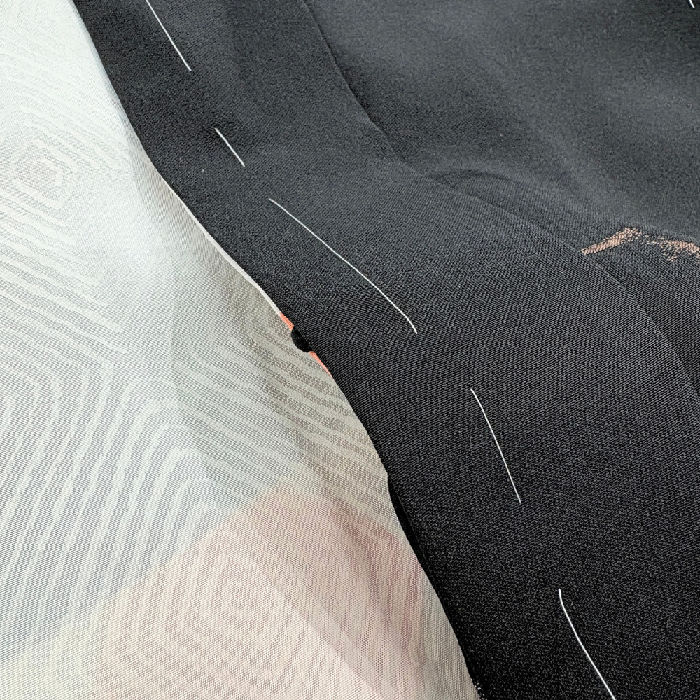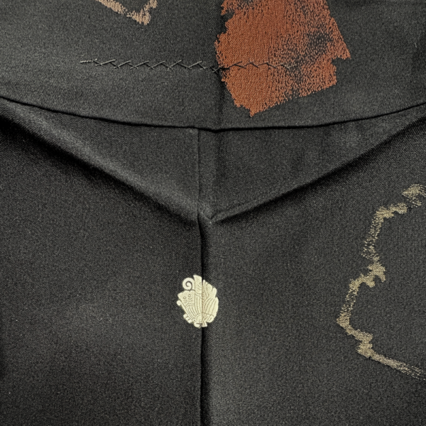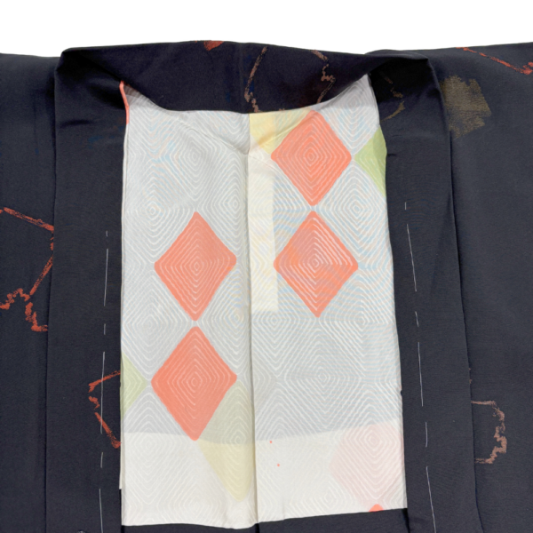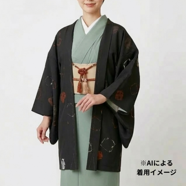 黒地に赤茶や銀の抽象的な幾何学紋様が散りばめられた、モダンで洗練されたデザインの羽織です。
