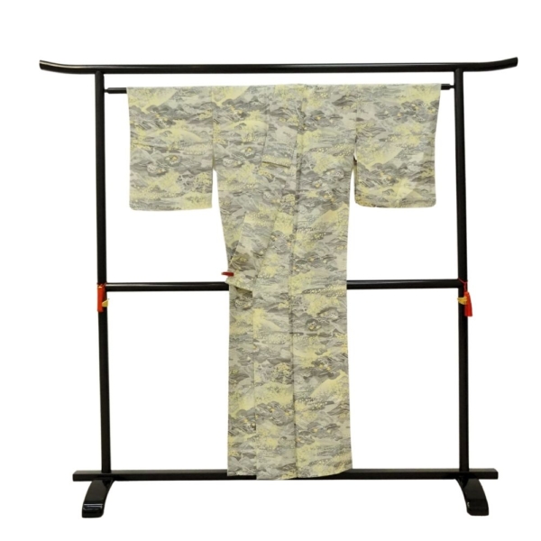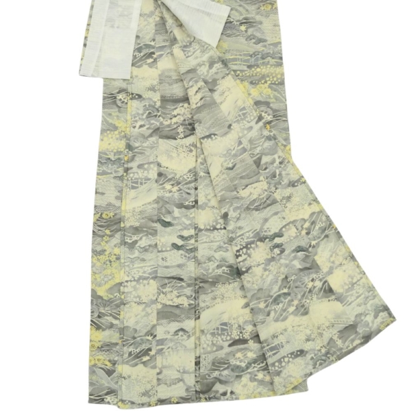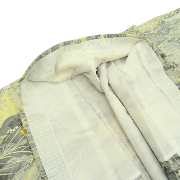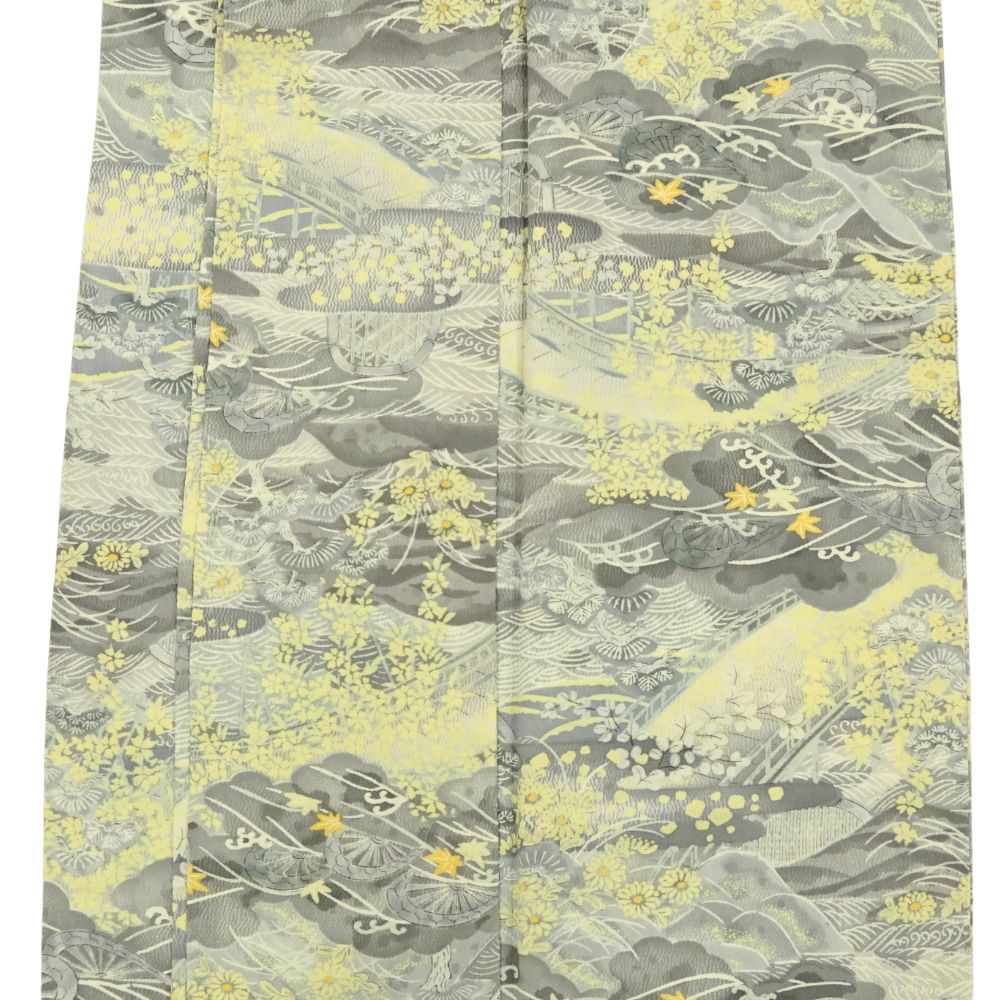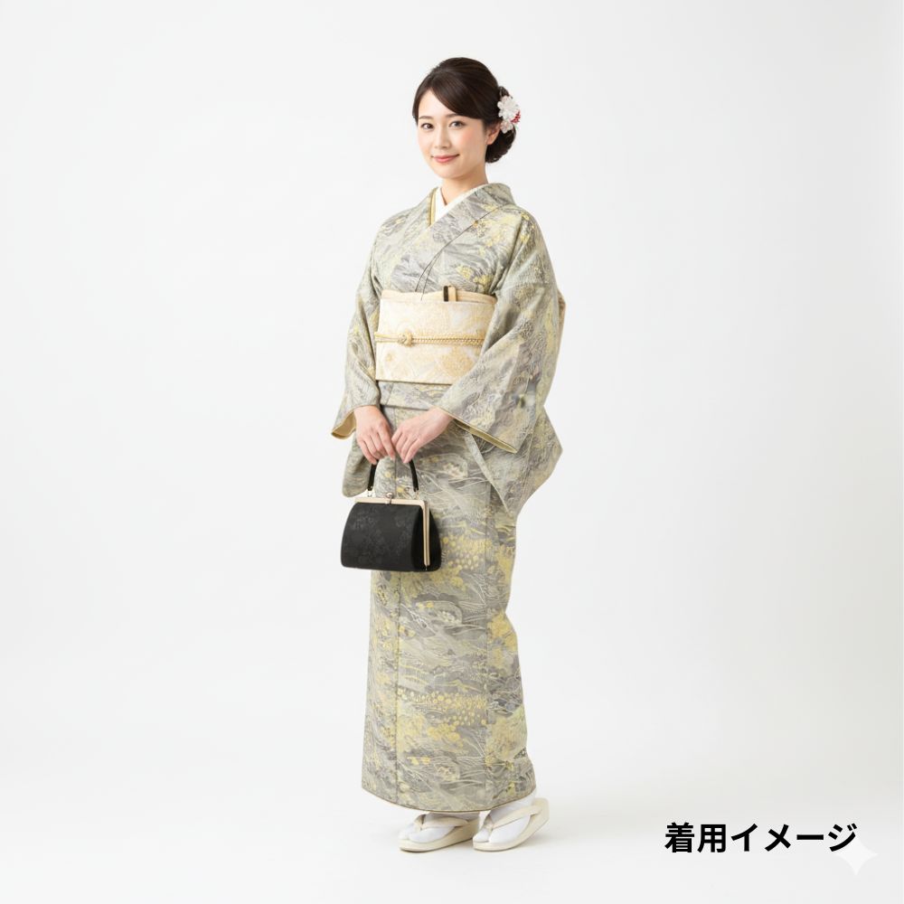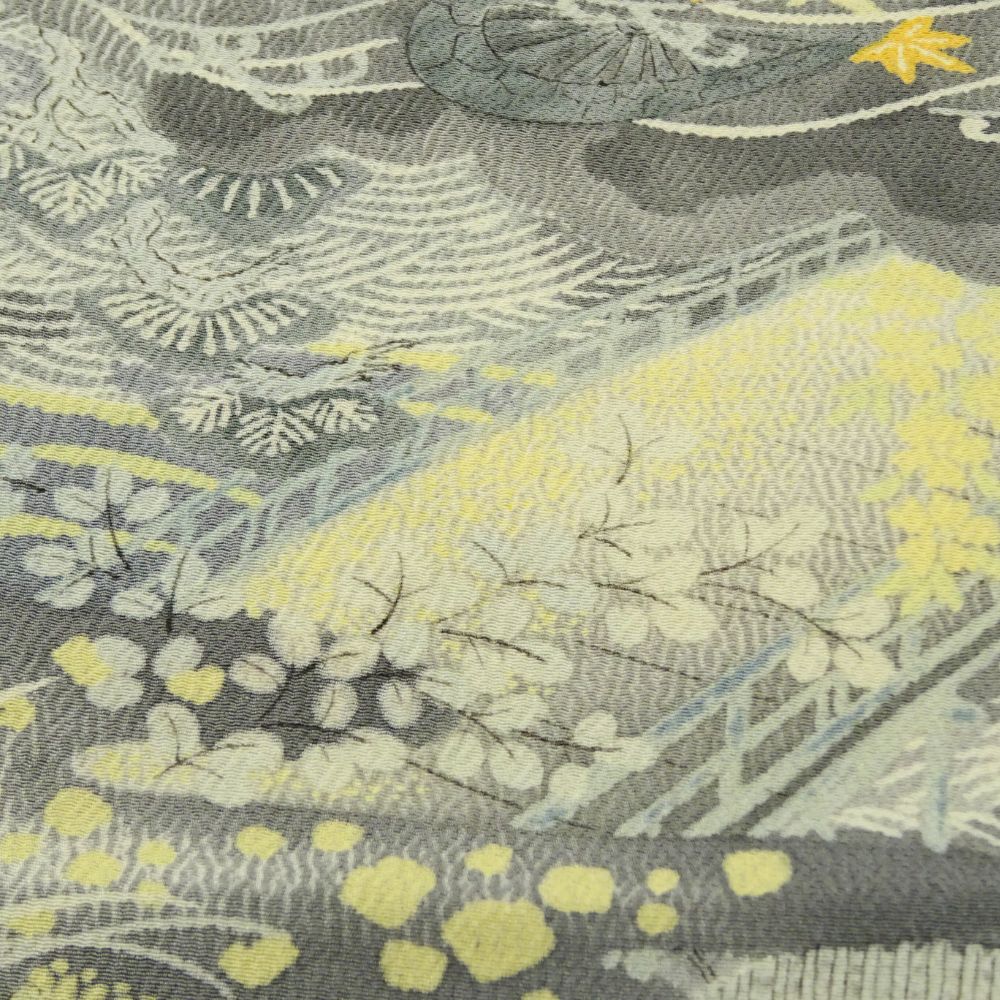 落ち着いたグレーを基調としながら、淡いイエローで描かれた松や山々がアクセントとなり、地味になりすぎず華やかな気品を漂わせます。