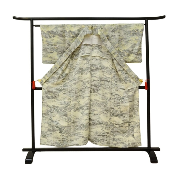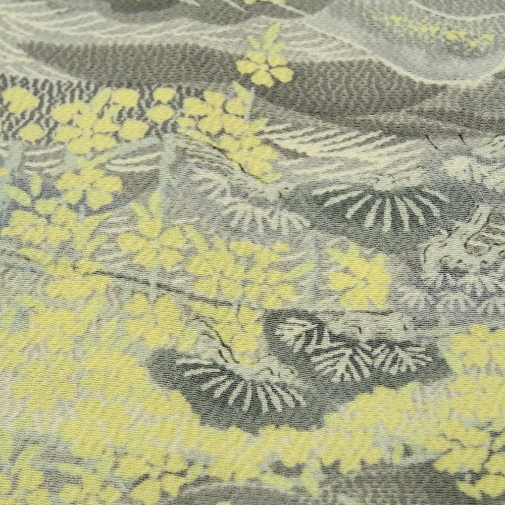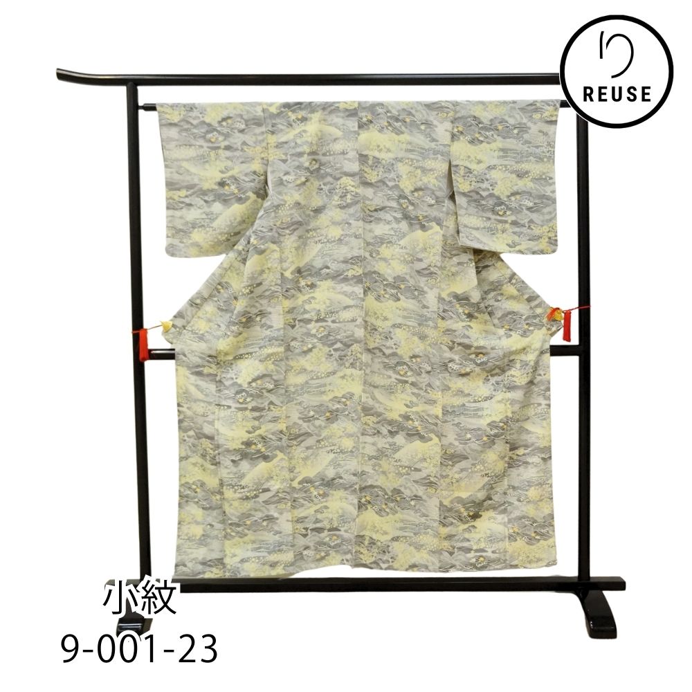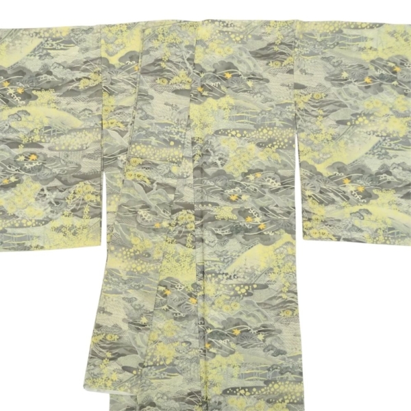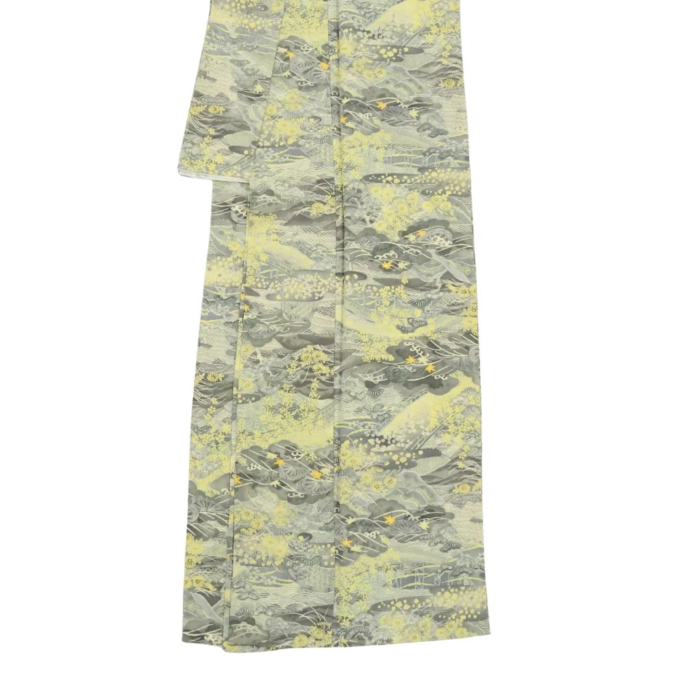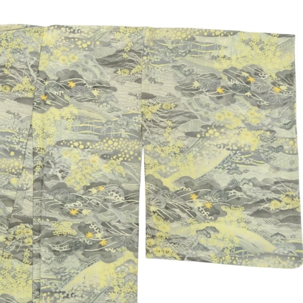 小紋 正絹 リユース 中古 単衣 型染め グレー地に黄色の差し色 山水松模様 9-001-23 (8050-00455)