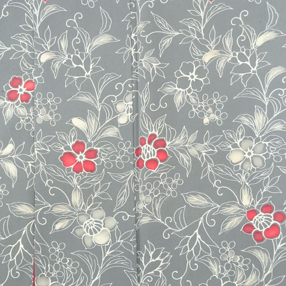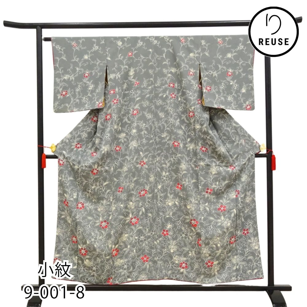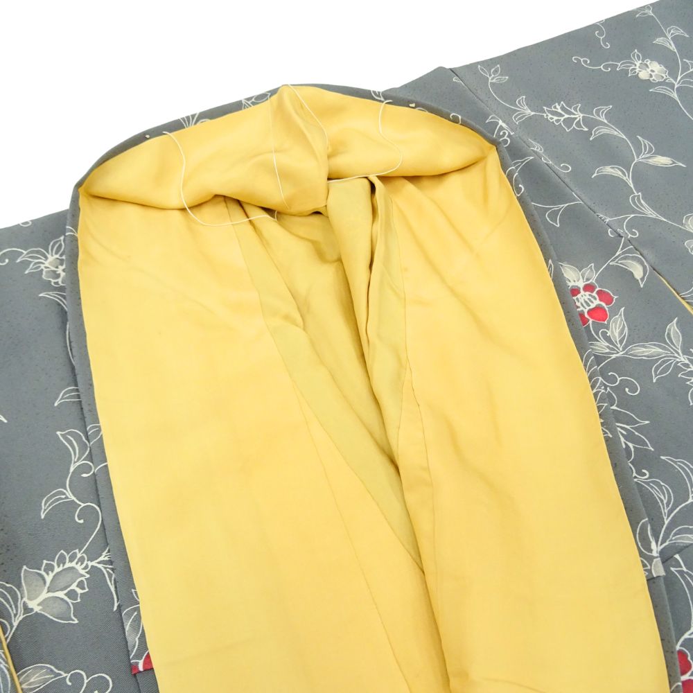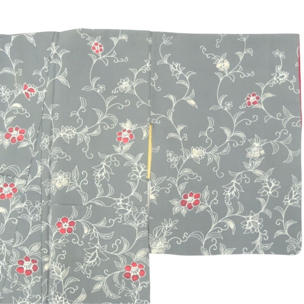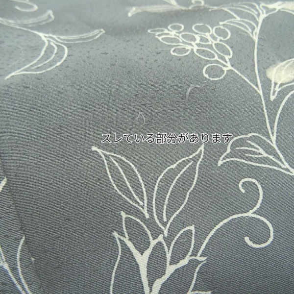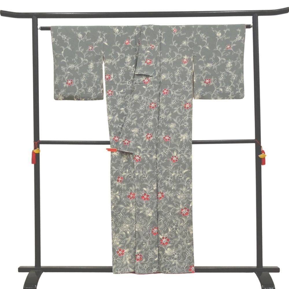 しっとりと落ち着いたグレー地に、流れるような更紗文様が美しく描かれた正絹の小紋です。