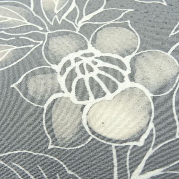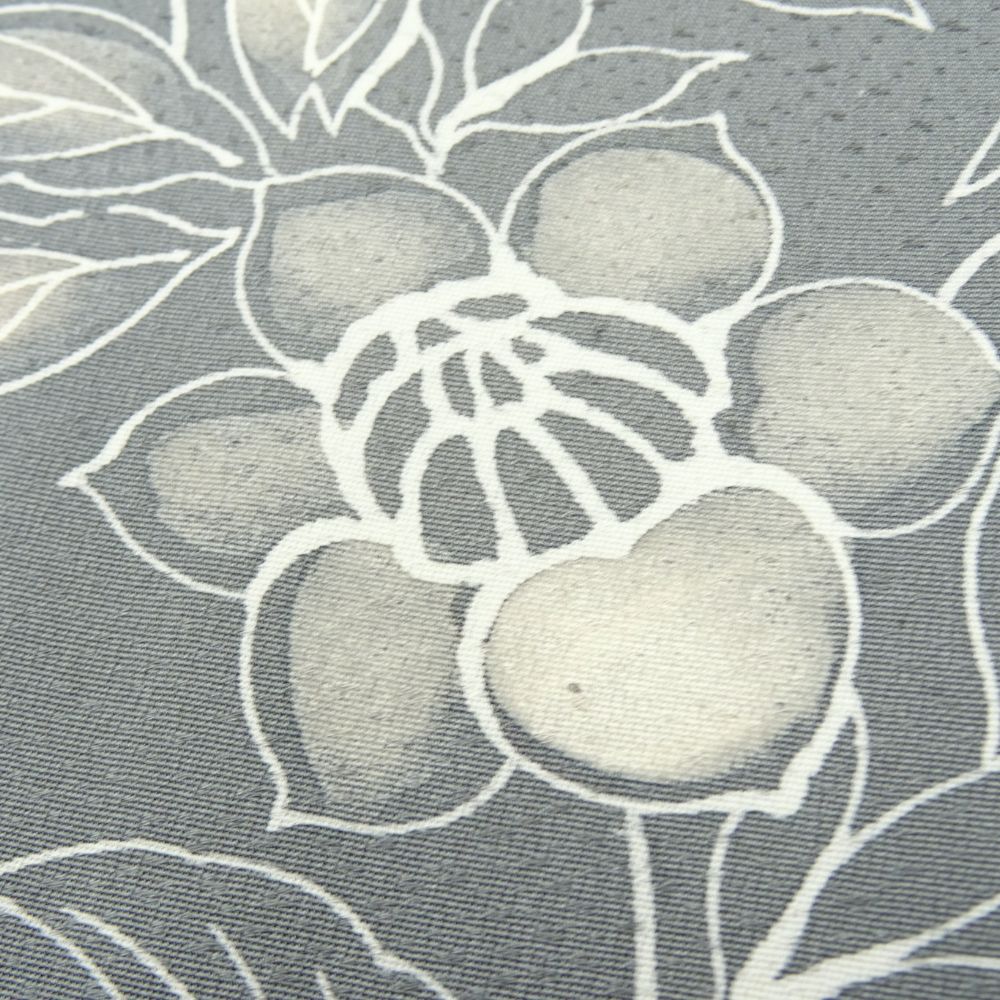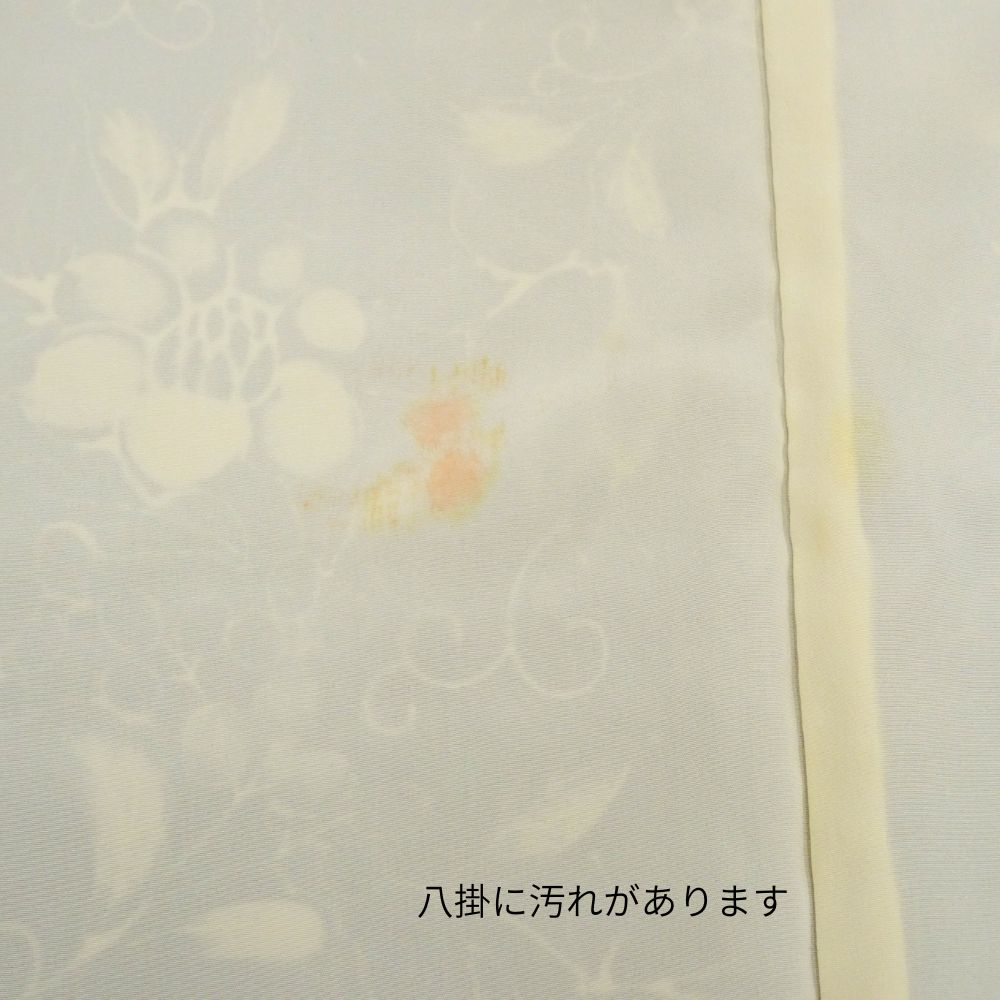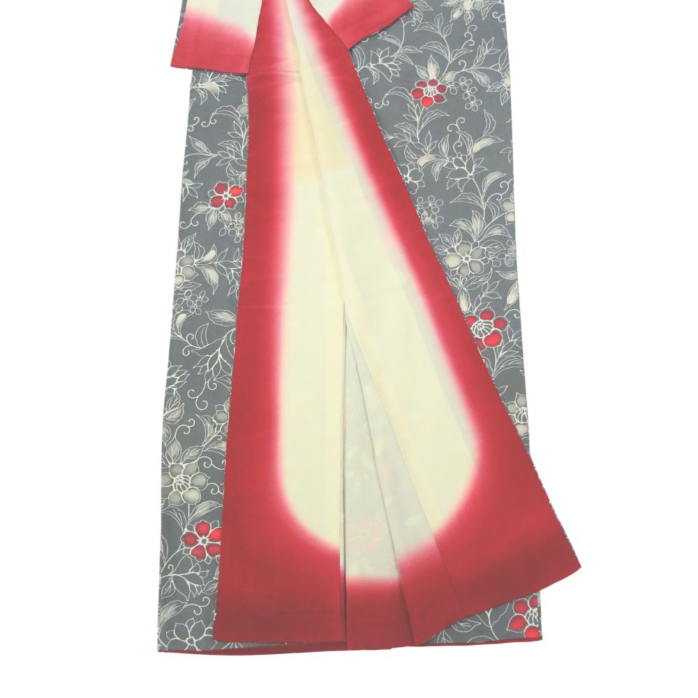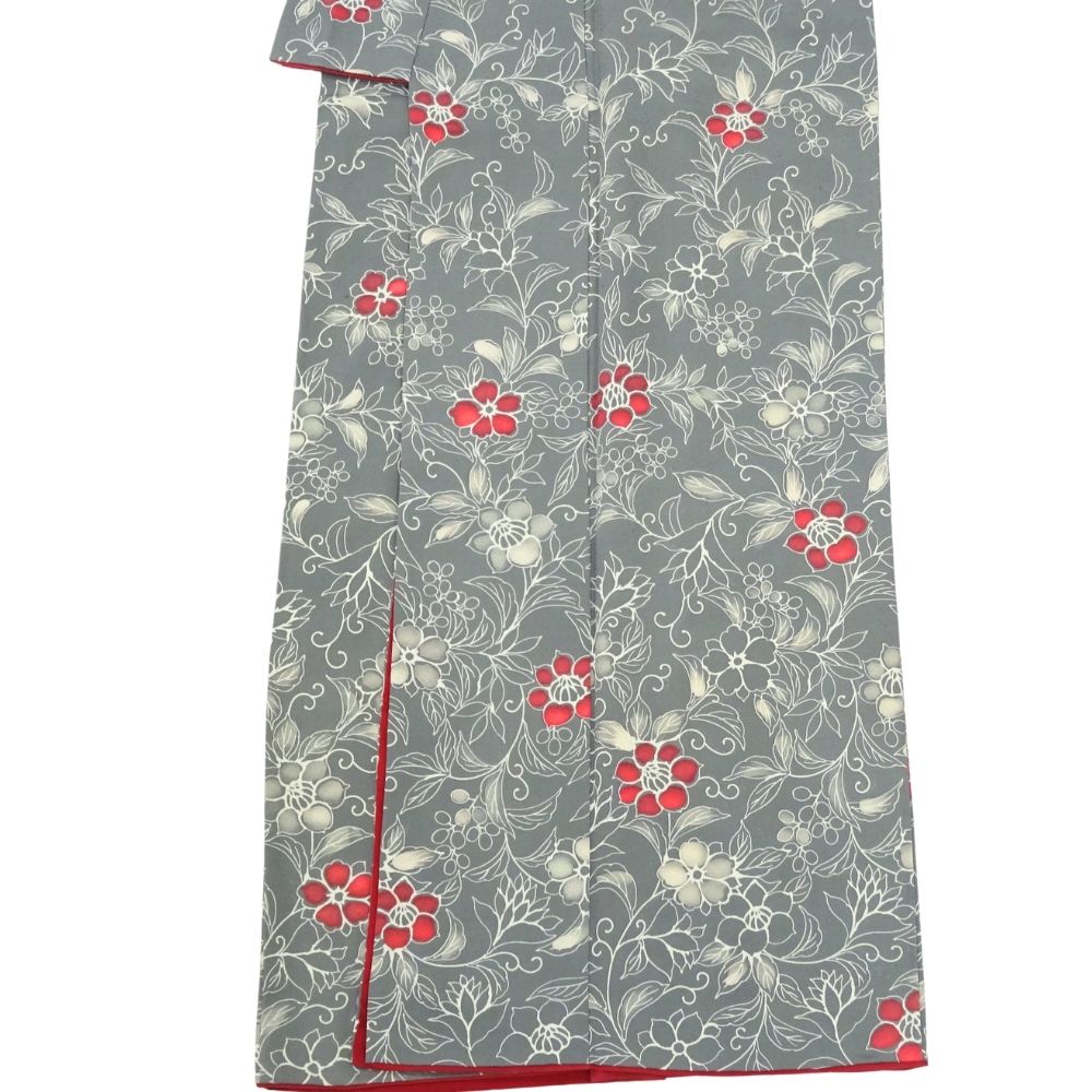 しっとりと落ち着いたグレー地に、流れるような更紗文様が美しく描かれた正絹の小紋です。