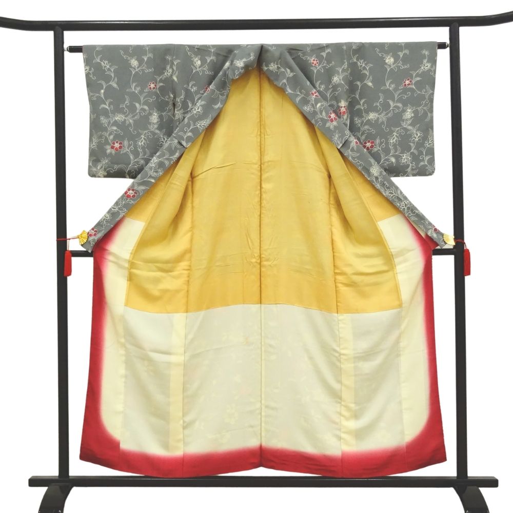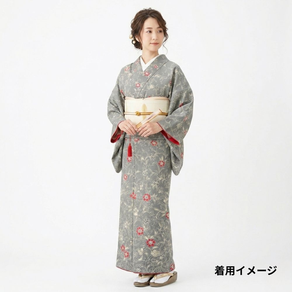 袖口や裾からちらりと覗く八掛の赤色も計算された、細部までこだわりを感じる一着です。