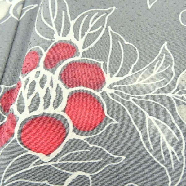 全体に施された繊細な唐草調のラインに、アクセントとして配された赤い花が、地味になりすぎず女性らしい華やかさを演出しています。