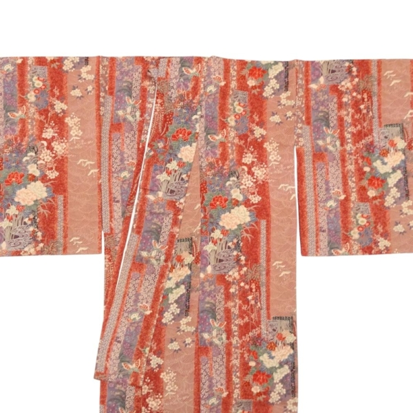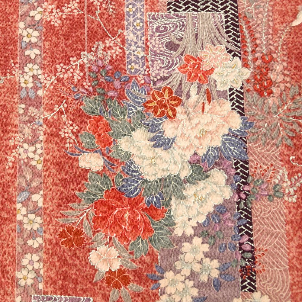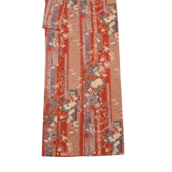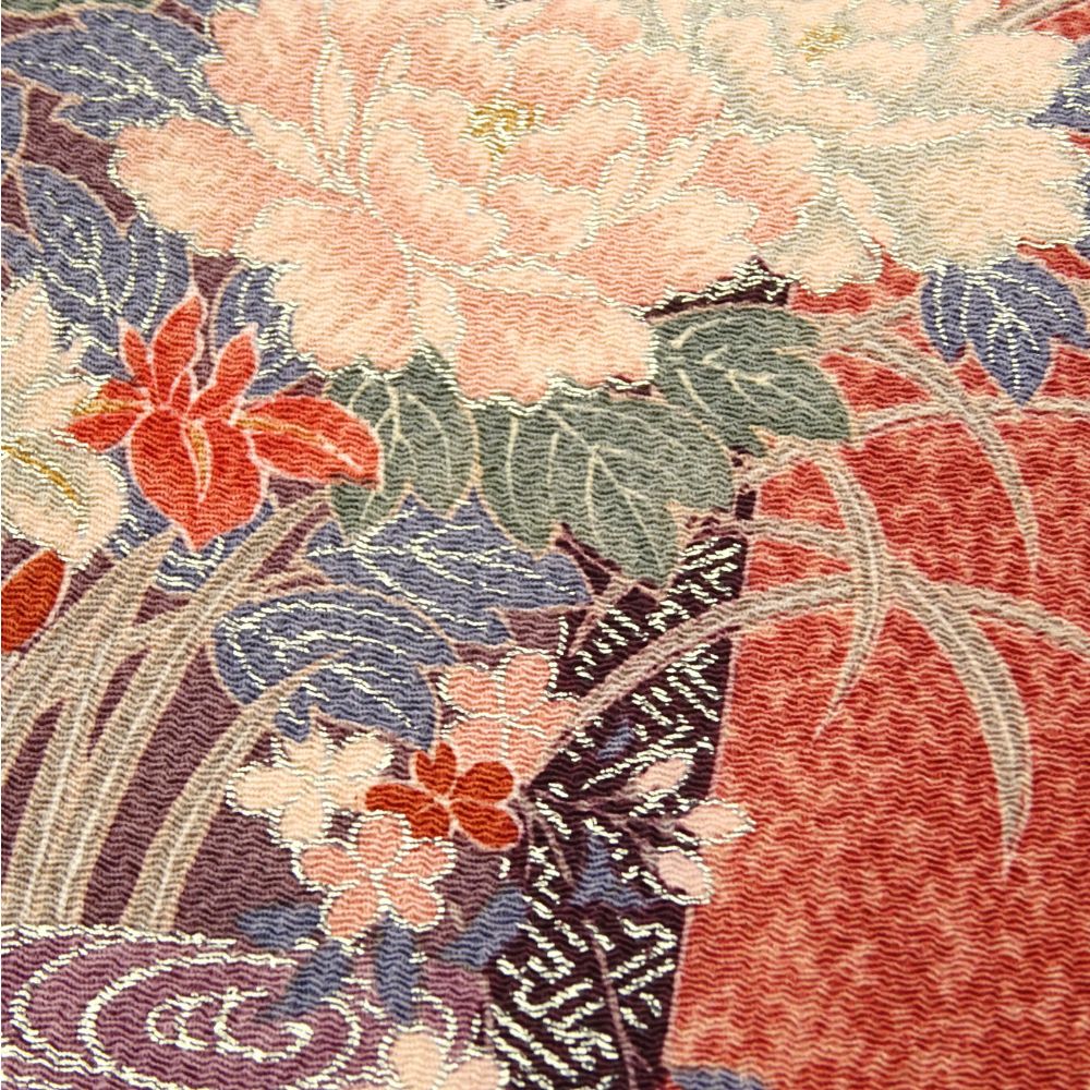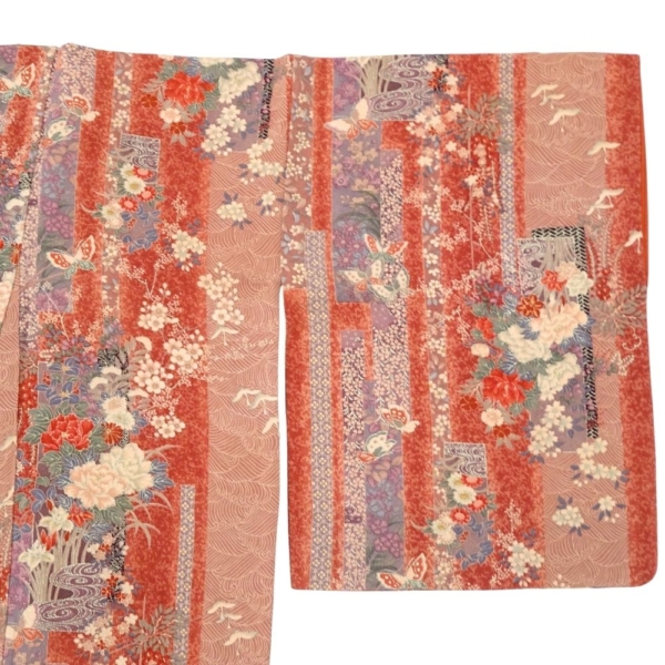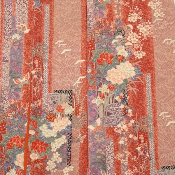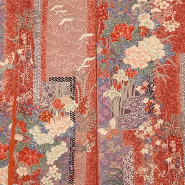 牡丹、桜、菊などの四季折々の花々が縦の区画(縞)の中に豪華に描かれています。また、蝶々や空を舞う鳥、流水文様なども配され、絵画のように美しい「花鳥風月」の情景が表現されています。