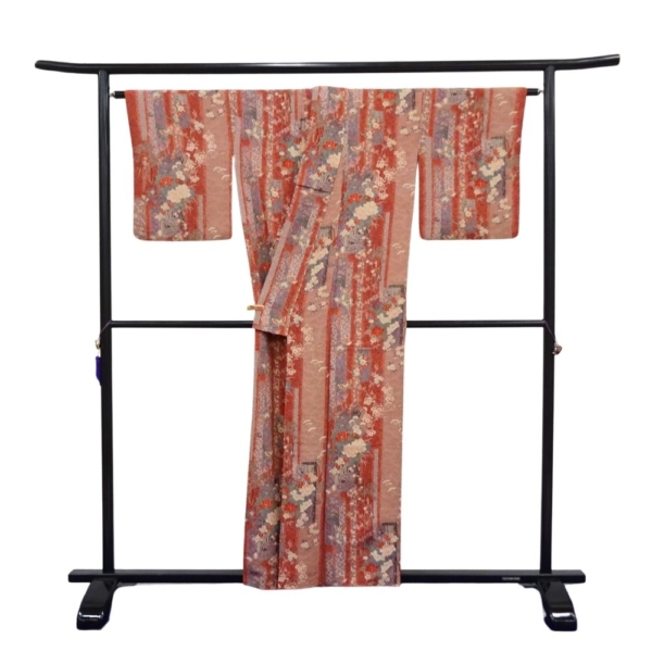 伝統的な日本の古典柄と、現代的な縦縞のデザインが融合した、非常に見栄えのする総柄の着物です。