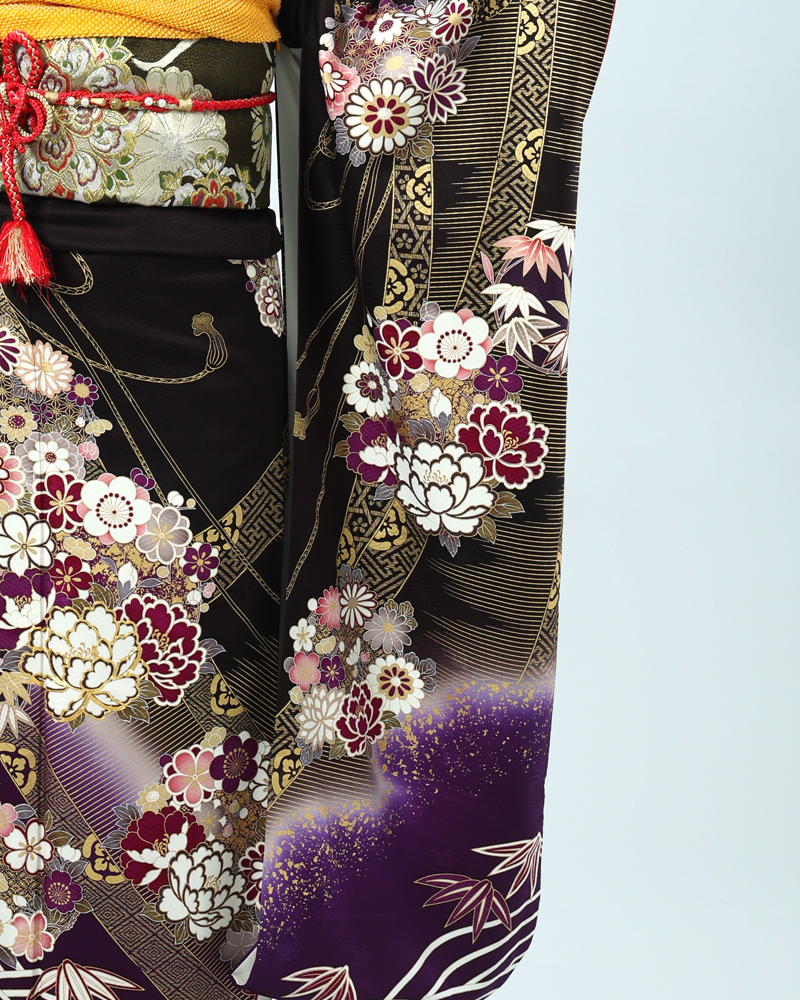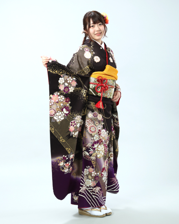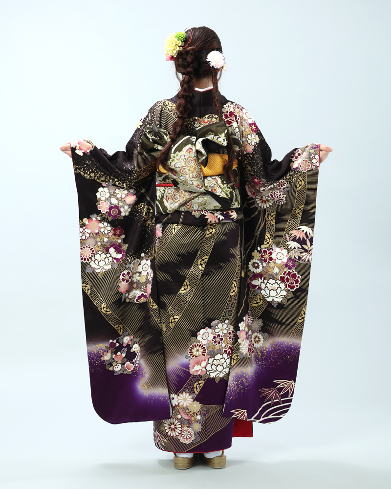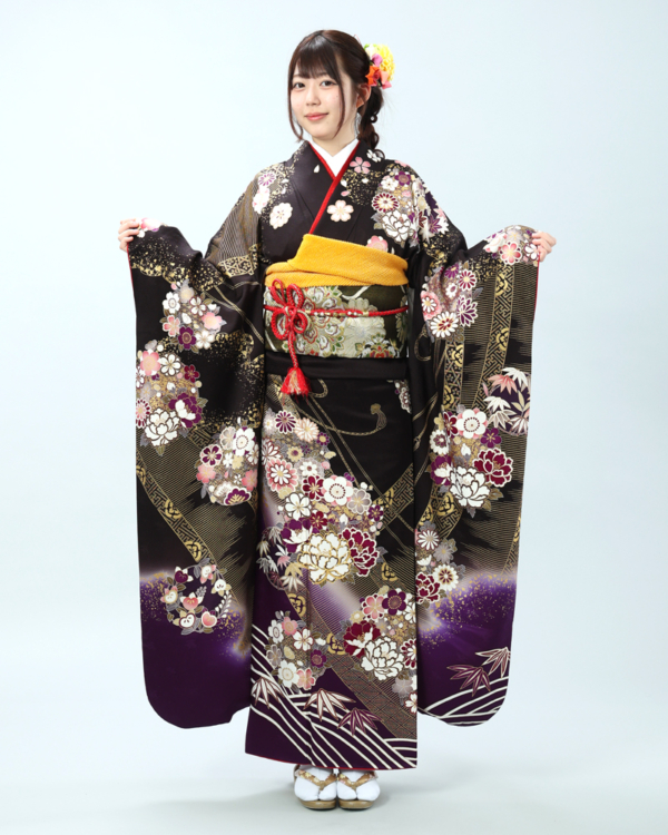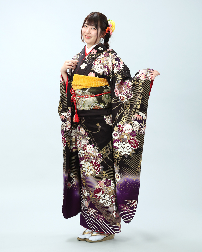 深い黒地に、金彩がふんだんにあしらわれた豪華絢爛な古典柄の振袖セットです。