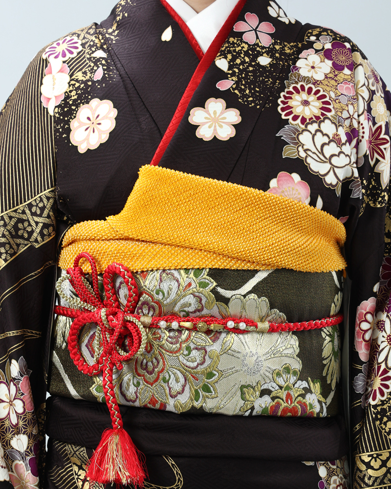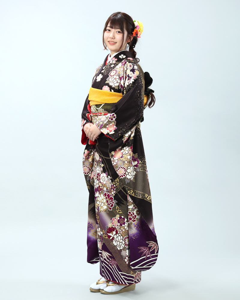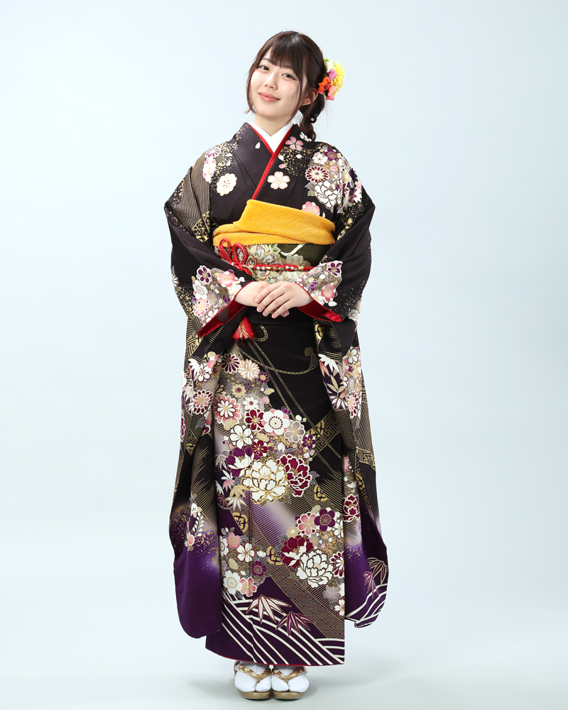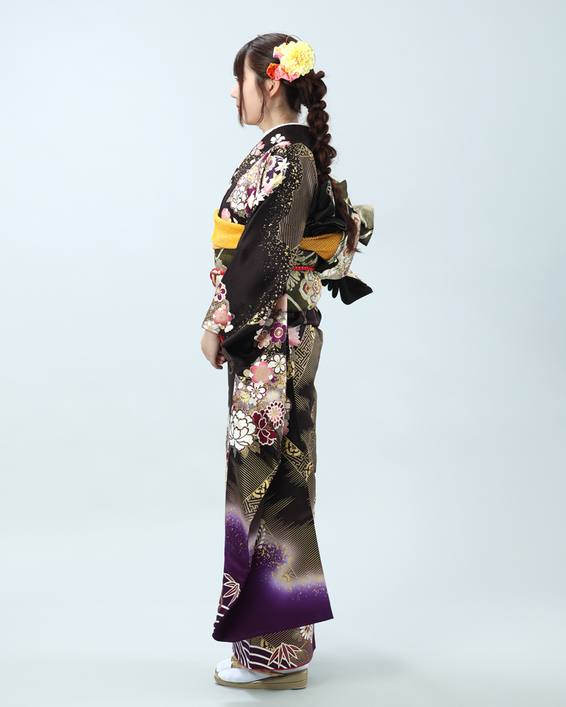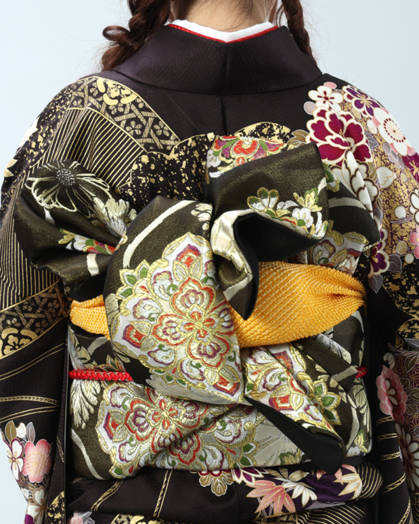 深い黒地に、金彩がふんだんにあしらわれた豪華絢爛な古典柄の振袖セットです。