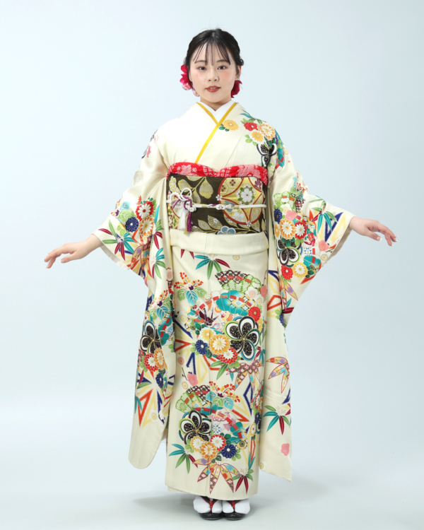 正統派の古典美と現代的な華やぎを両立 柔らかなクリーム色の地に、楓や菊、梅、桜、そして扇などの伝統的な吉祥文様が所狭しと豪華に描かれた、格調高い正絹振袖です。
