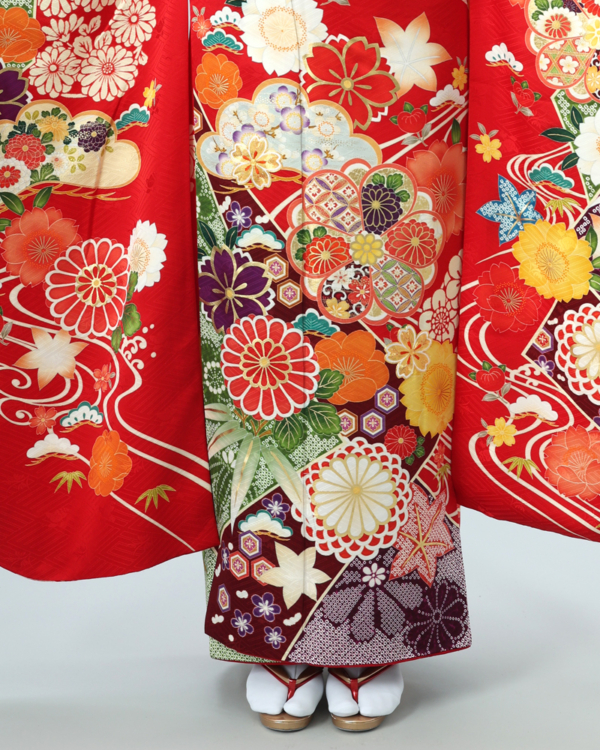 大輪の菊、梅、牡丹などの華やかな四季の花々を基調とし、流れの美しい流水文や、吉祥文様である七宝繋ぎなどの伝統的な意匠が、非常に密に、かつ多色使いで描かれています。