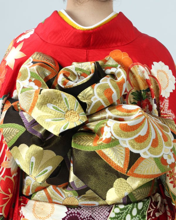 光の反射で美しく輝く金彩加工が随所に施されており、振袖全体の重厚感と高級感を高めています。