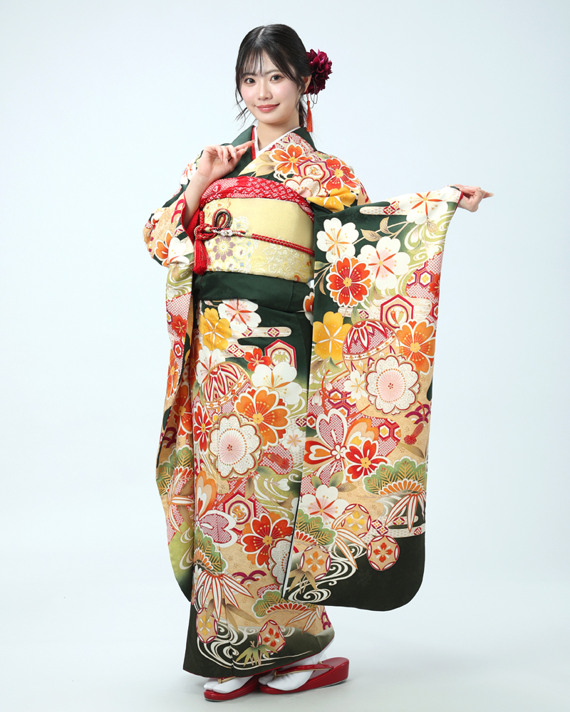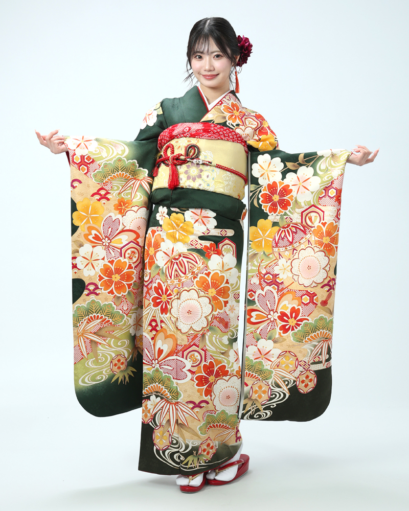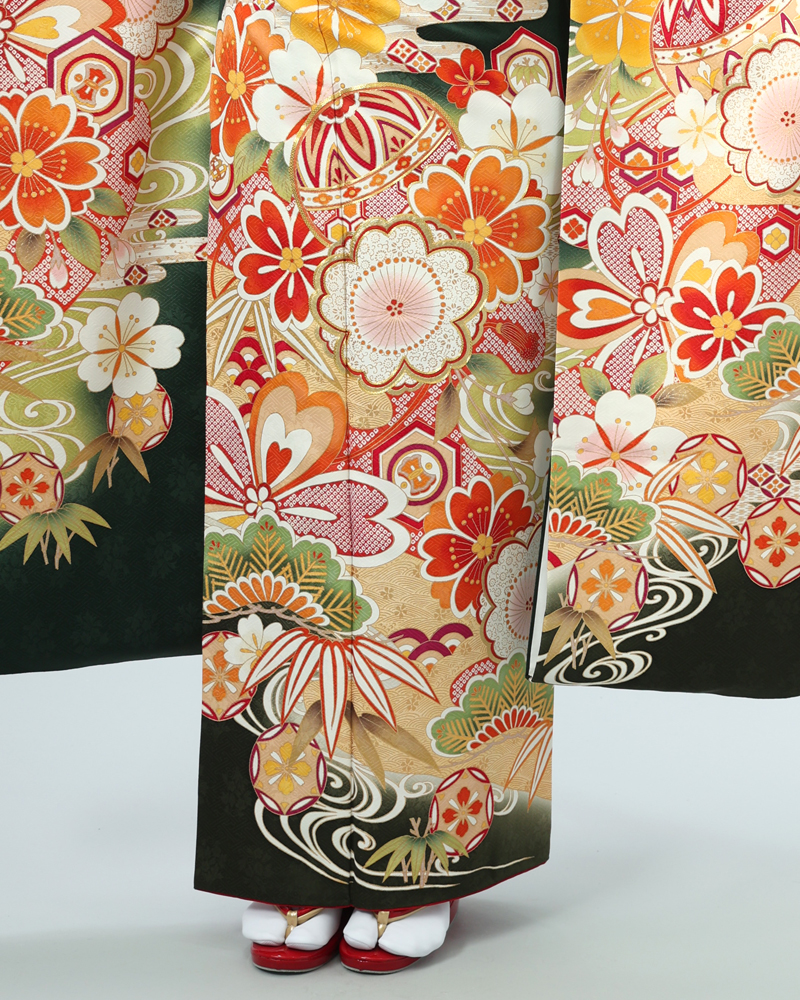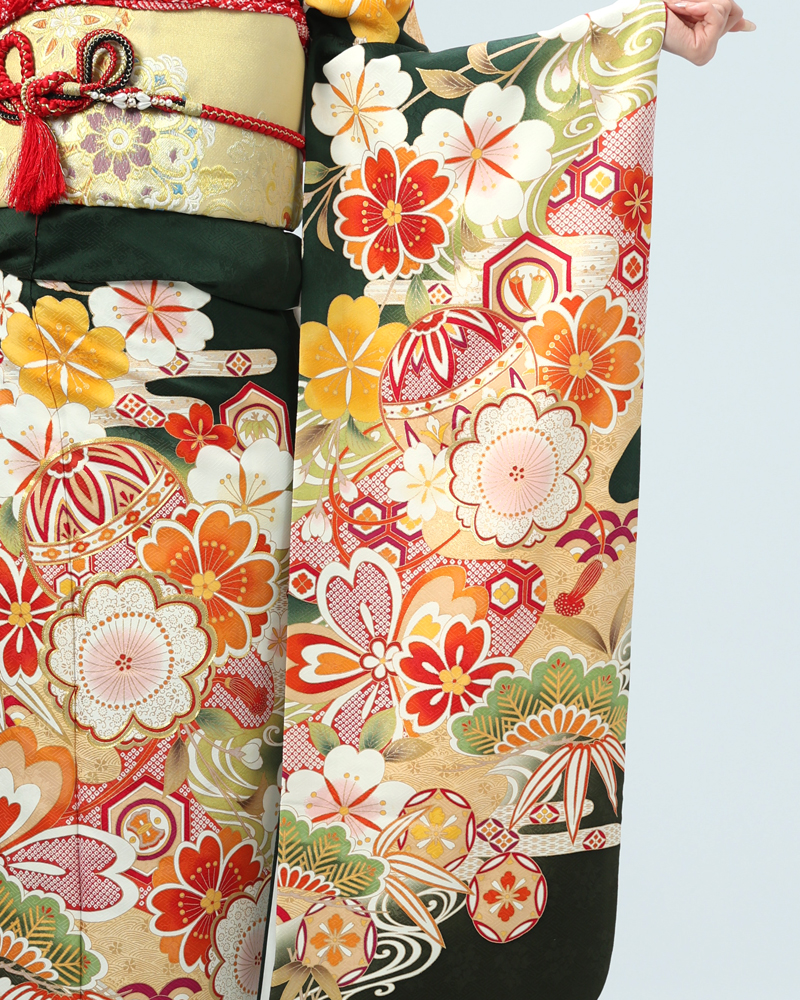 落ち着いた深緑は、近年人気の高まっている色味であり、また松竹梅や手毬などの吉祥文様は時代を問わず愛されるモチーフです。