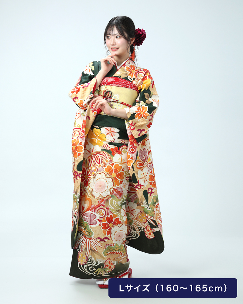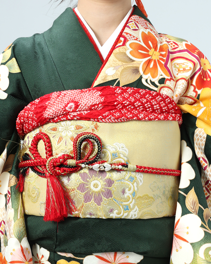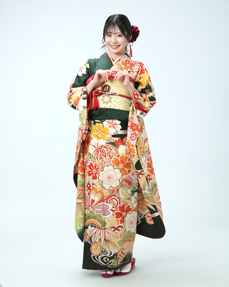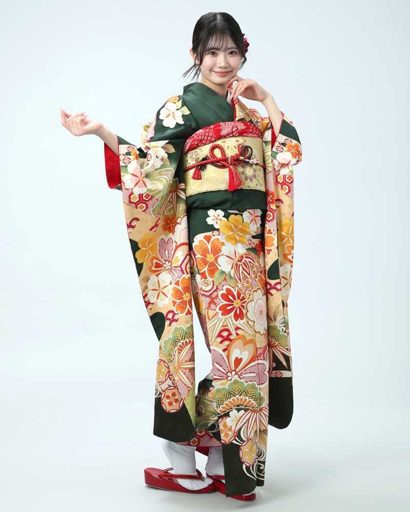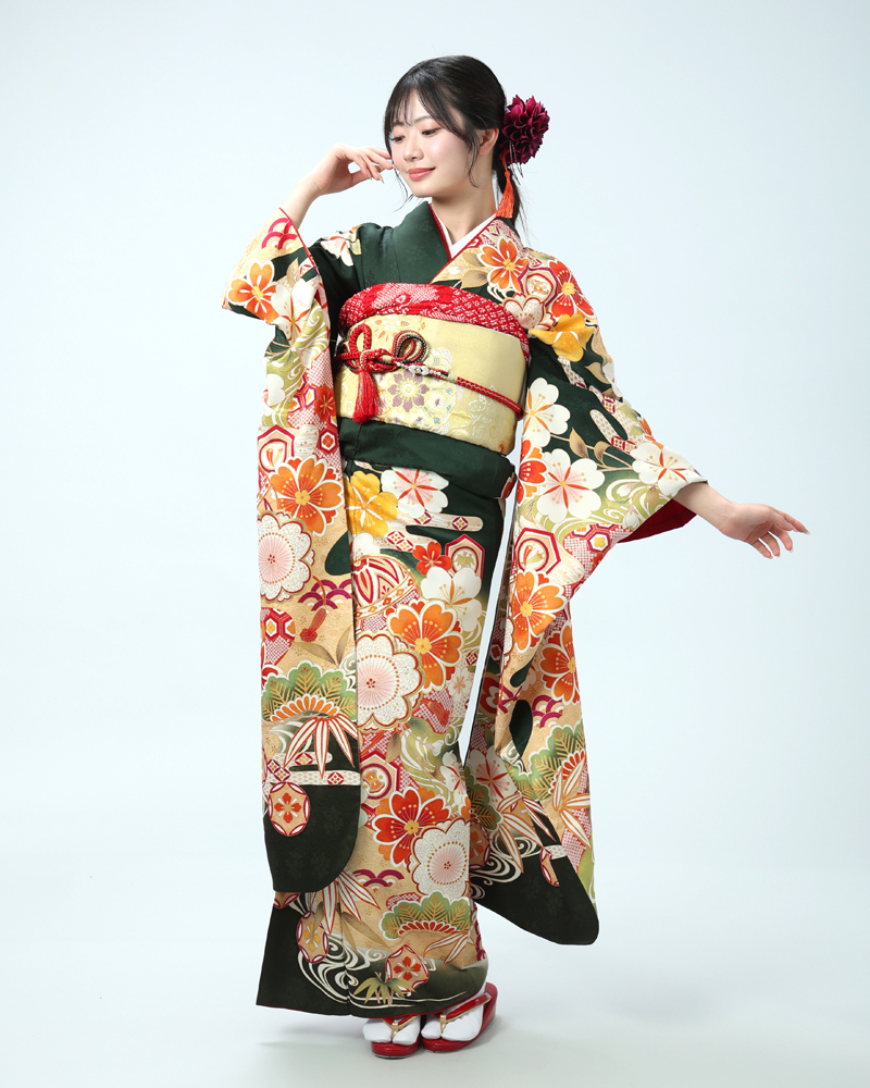 落ち着いた深緑は、近年人気の高まっている色味であり、また松竹梅や手毬などの吉祥文様は時代を問わず愛されるモチーフです。