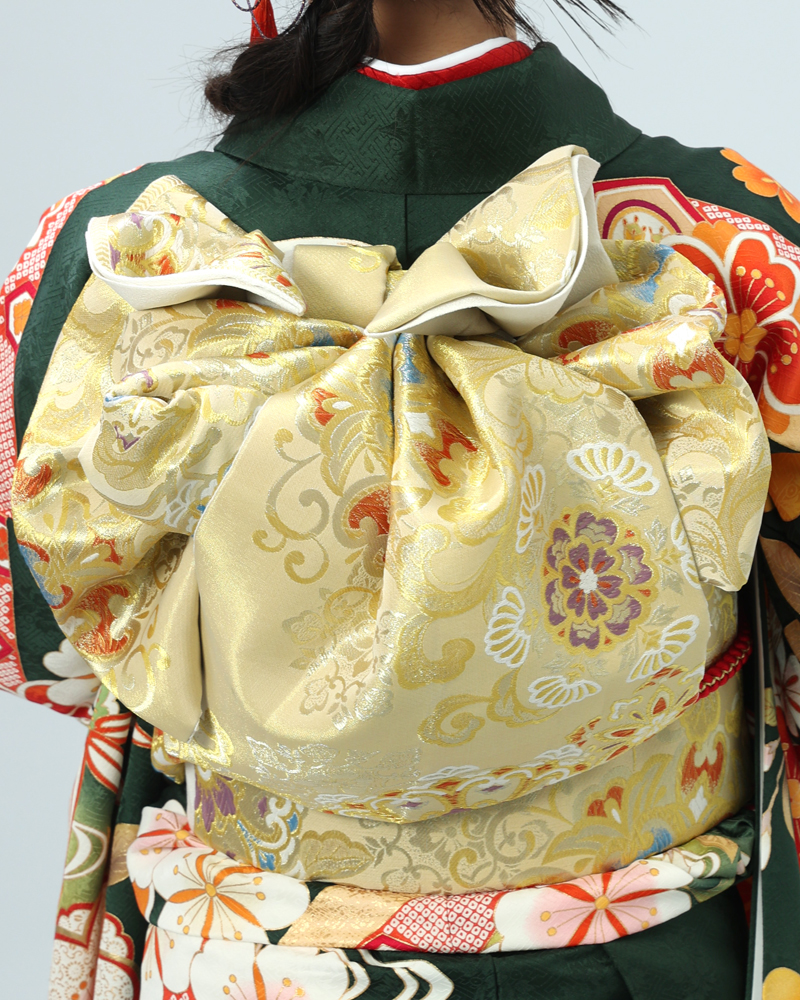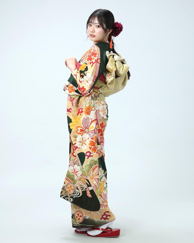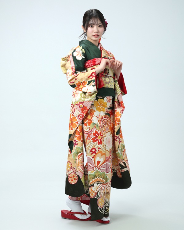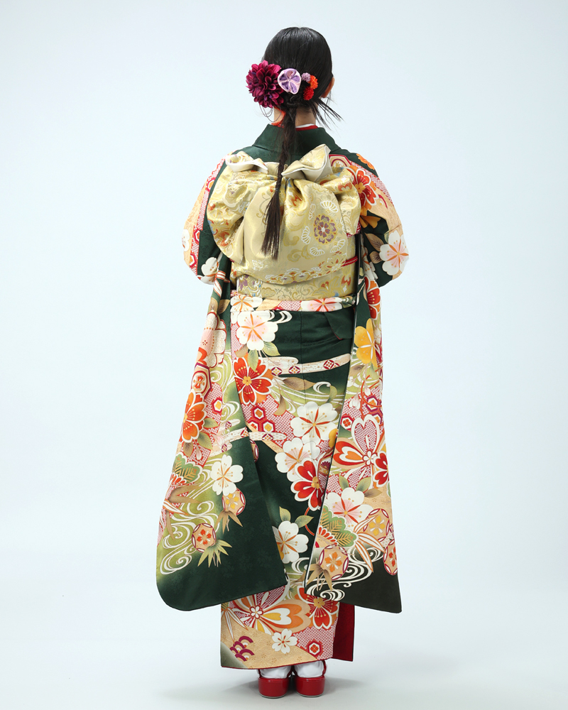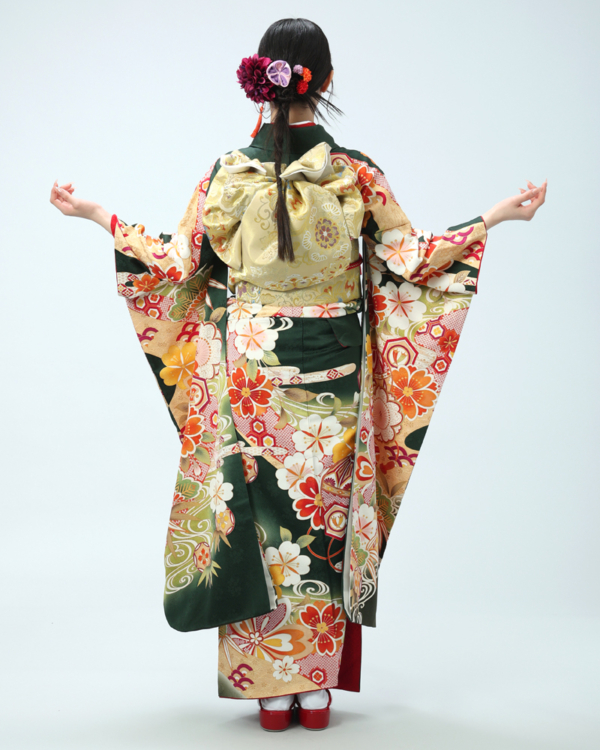 裾や袖口には濃い緑色で引き締め、地色のグラデーションや、柄の周りの金彩加工、金駒刺繍が、振袖全体に重厚な格式を与えています。