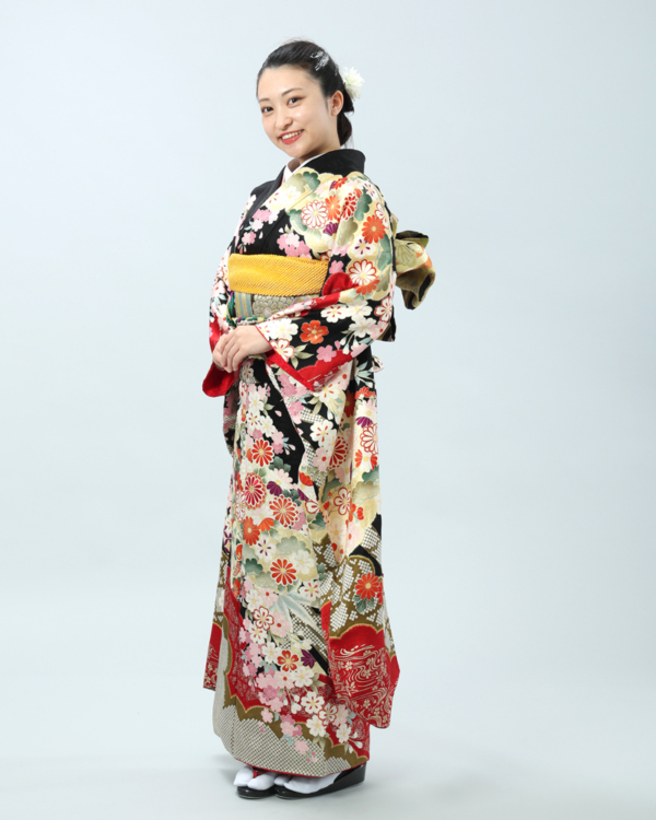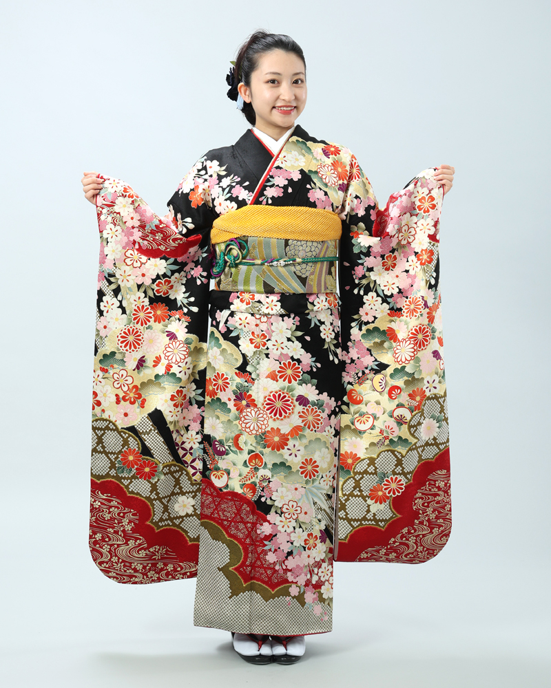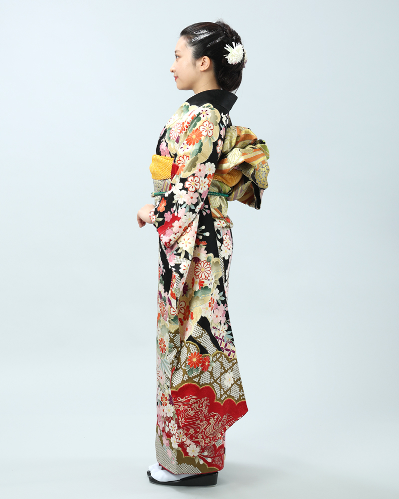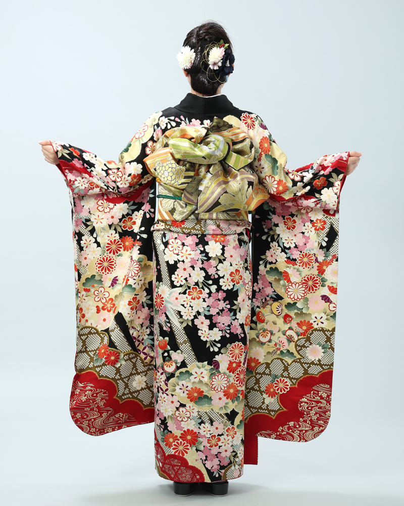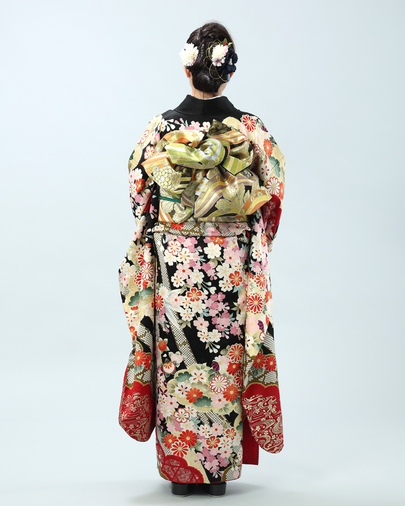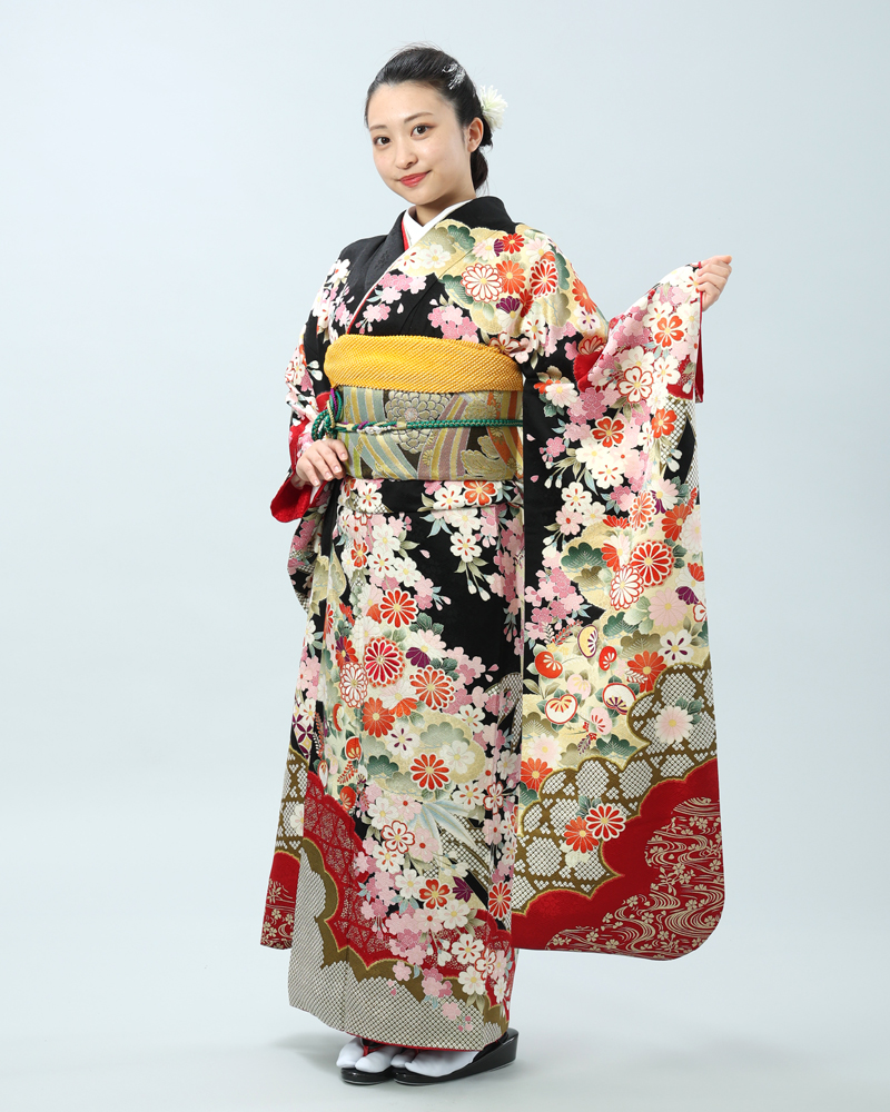 格調高い黒地に、日本の四季を彩る桜と菊を主役に、様々な吉祥文様が贅沢に描かれた、豪華絢爛な古典柄の振袖セットです。