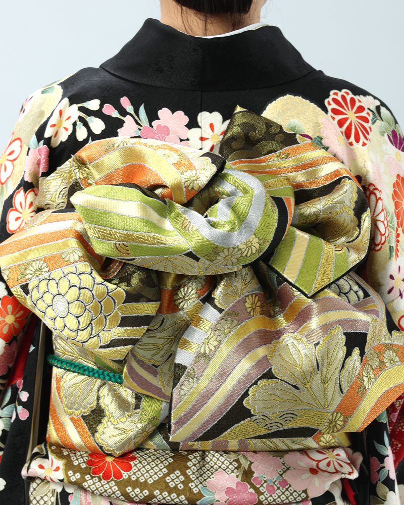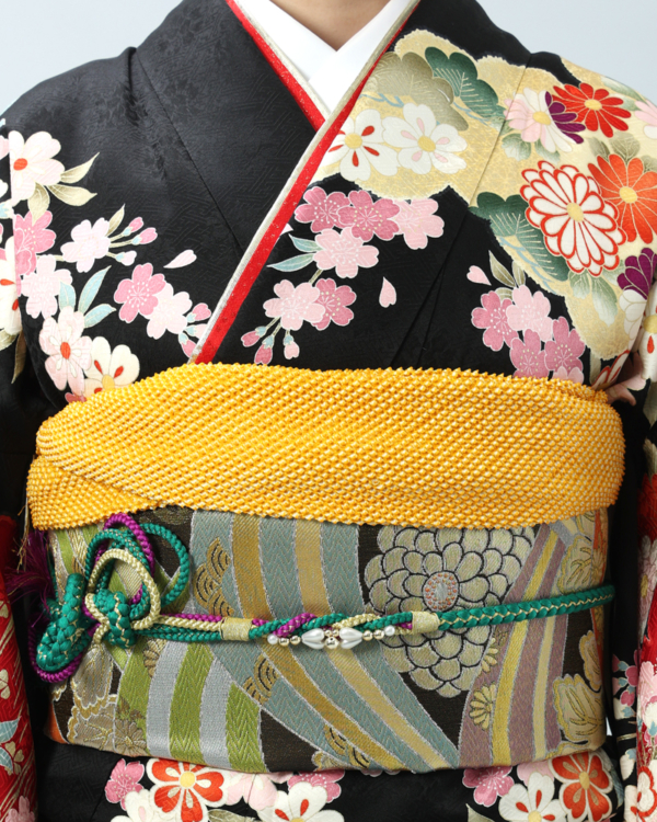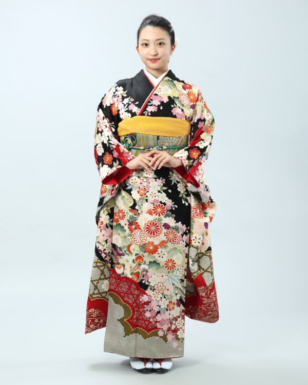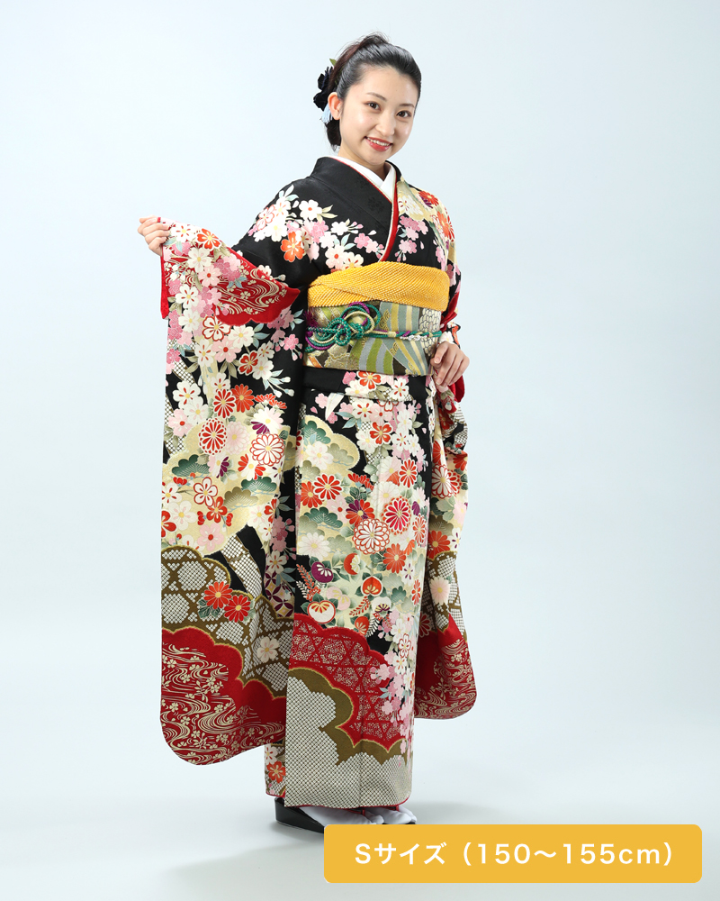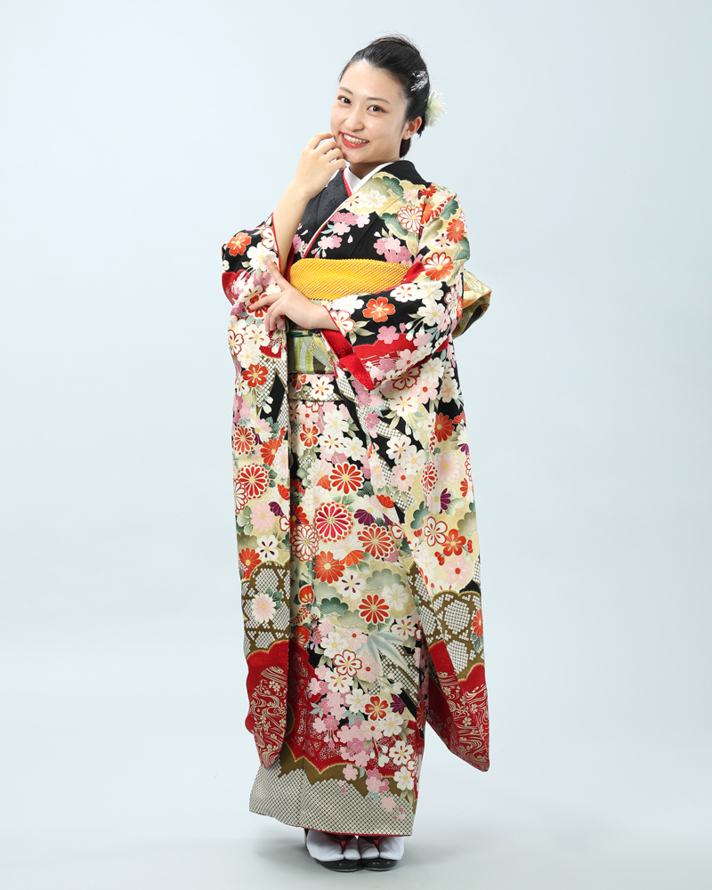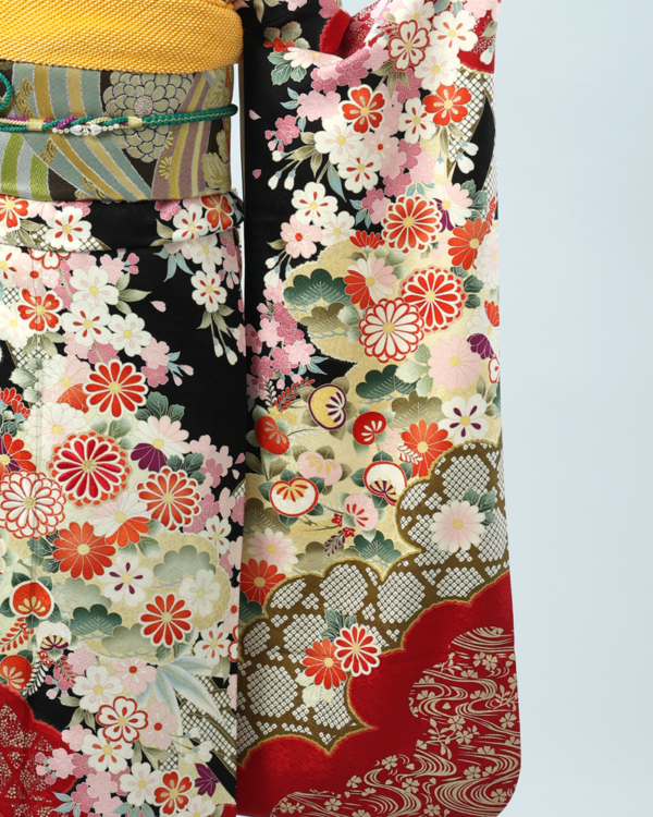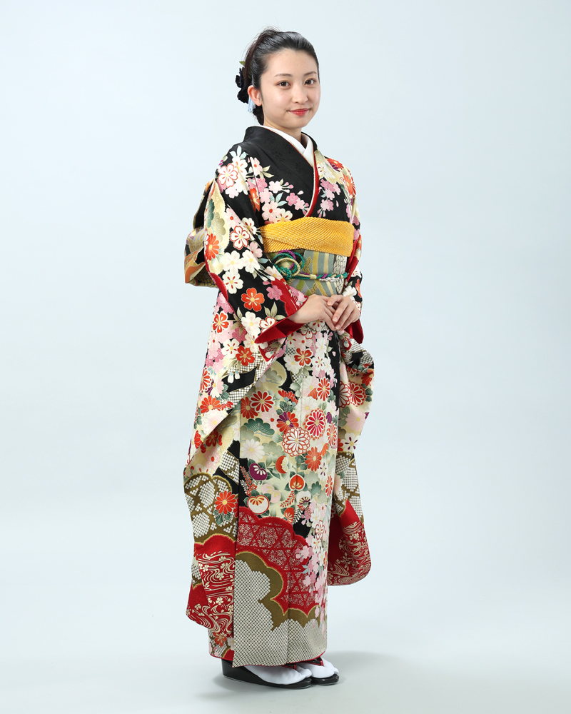 格調高い黒地に、日本の四季を彩る桜と菊を主役に、様々な吉祥文様が贅沢に描かれた、豪華絢爛な古典柄の振袖セットです。