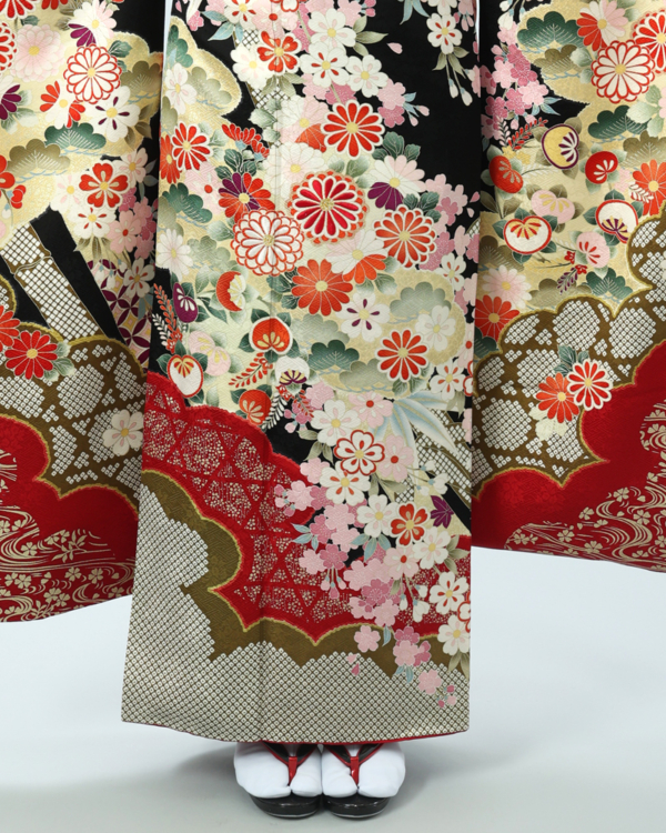 裾周りには、雲取りなどの古典的なモチーフが大胆に配置され、深みのある赤との切り替えが全体を引き締める、力強く美しいデザインです。