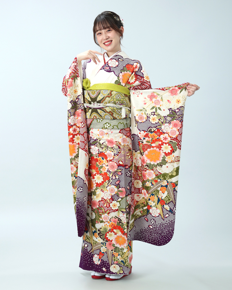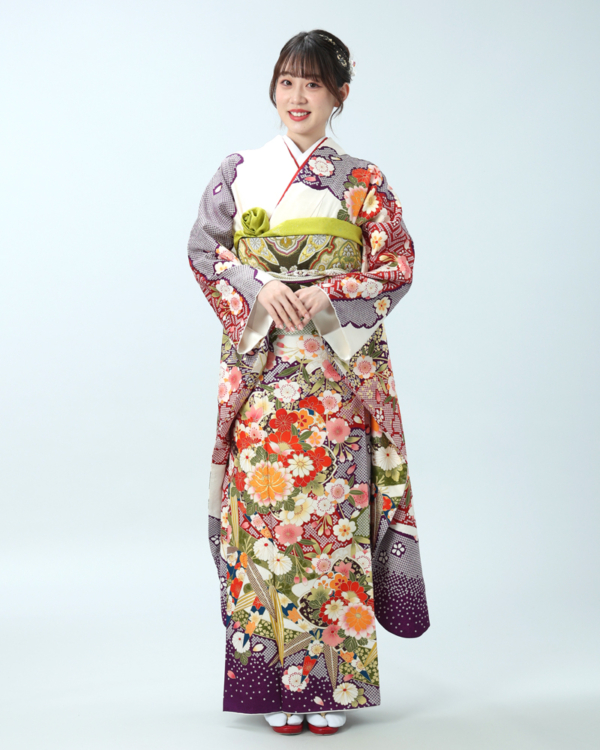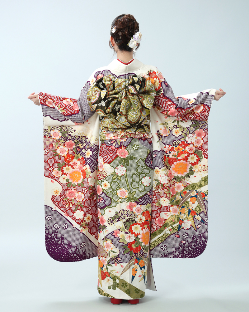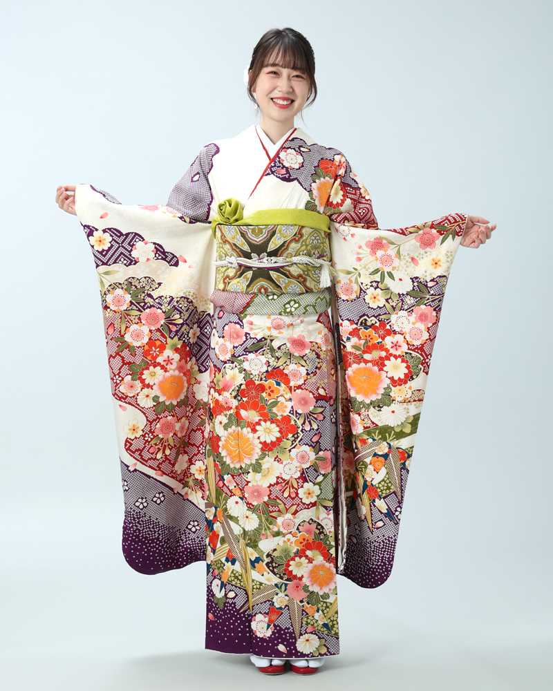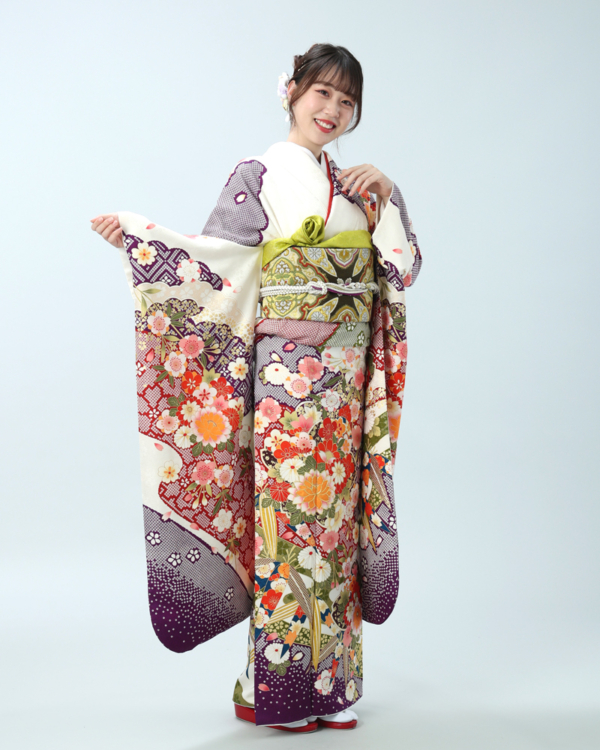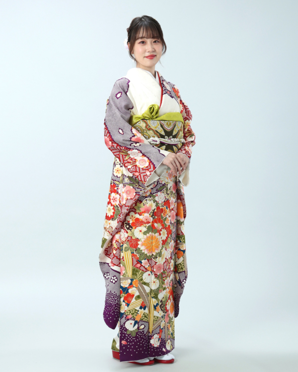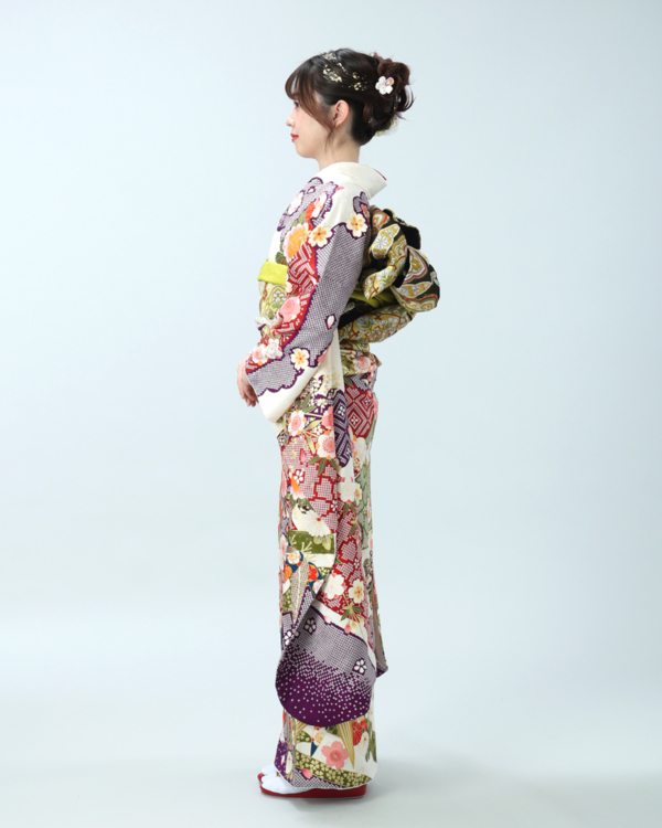 こちらの振袖は、「清楚な白地」をメインに、袖や身頃に「朱赤」「抹茶グリーン」「深い紫」を曲線的に染め分けた、非常に愛らしく、優雅な印象を与える一着です。