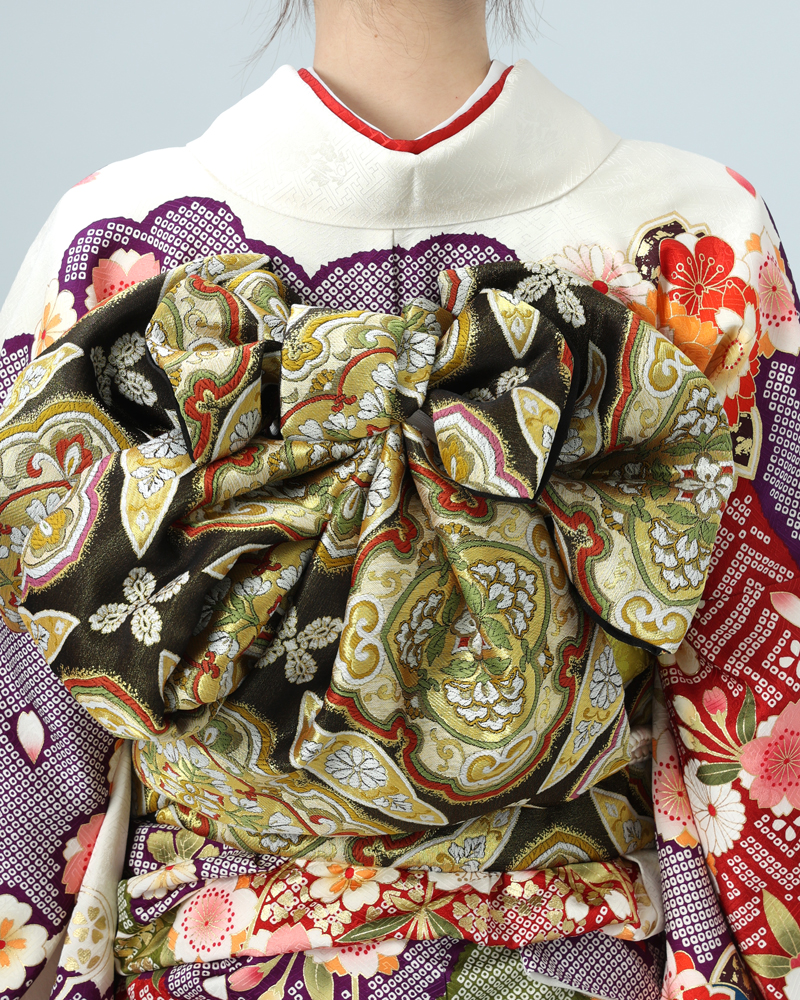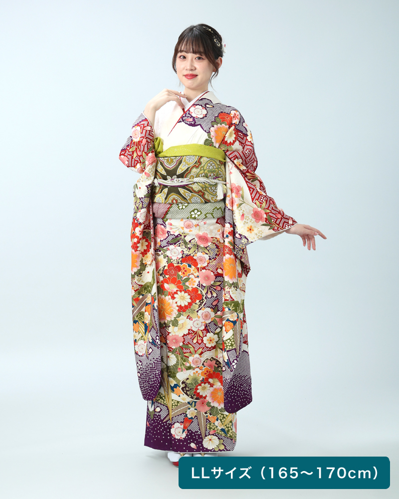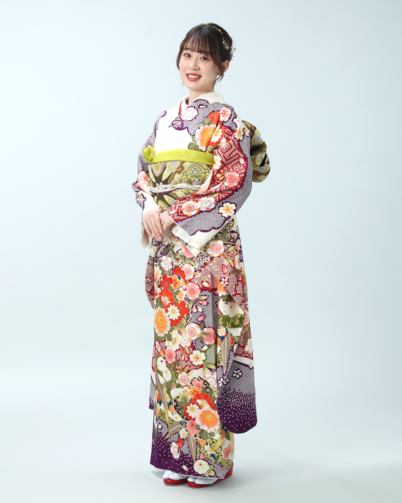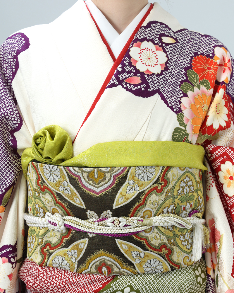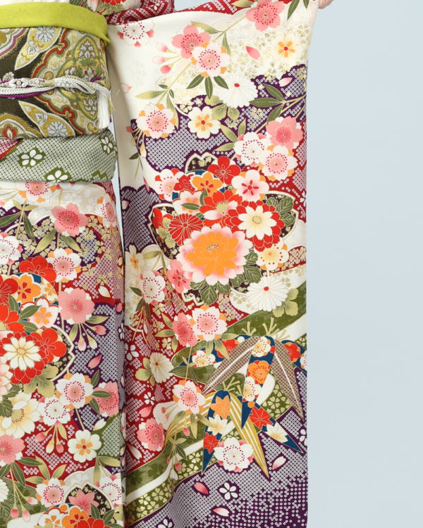 こちらの振袖は、「清楚な白地」をメインに、袖や身頃に「朱赤」「抹茶グリーン」「深い紫」を曲線的に染め分けた、非常に愛らしく、優雅な印象を与える一着です。