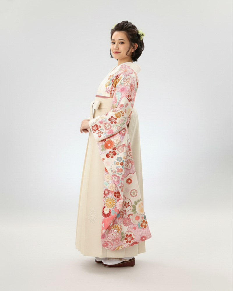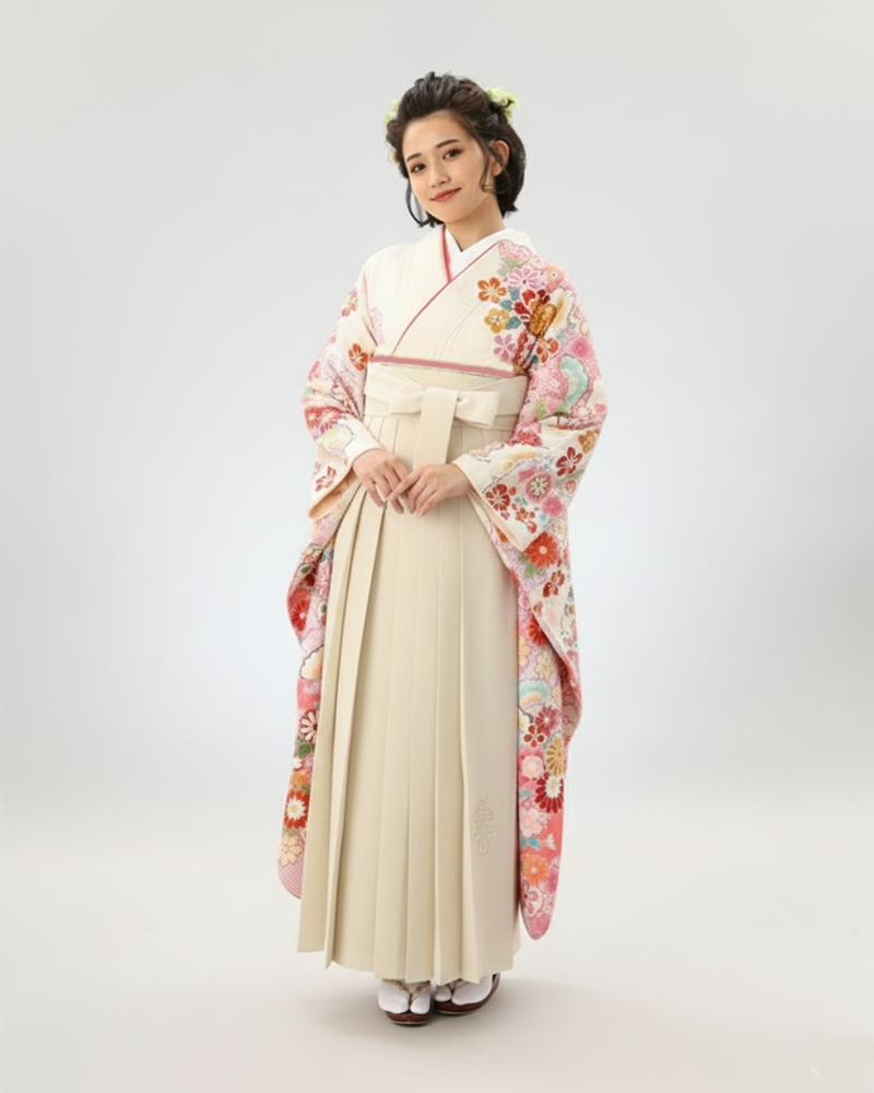 卒業式 袴 |振袖 白地にピンクの暈し 菊や桜等の花々 Mサイズ・ アイボリー袴