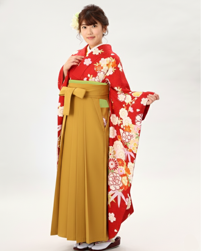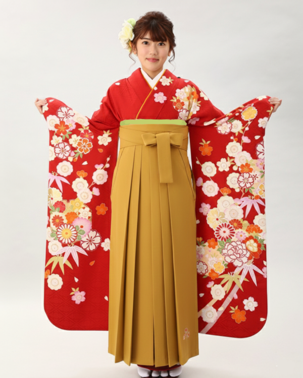 卒業式 袴 |振袖 赤地に雪輪と色とりどりの花々 Sサイズ・ カラシ色袴