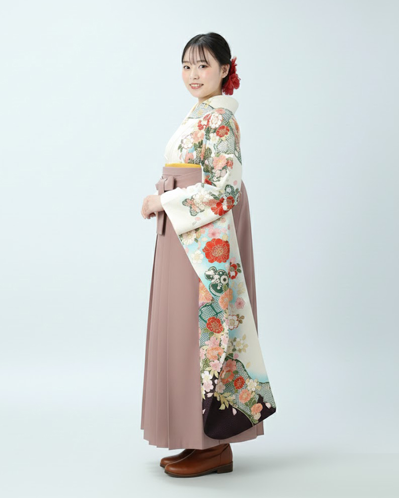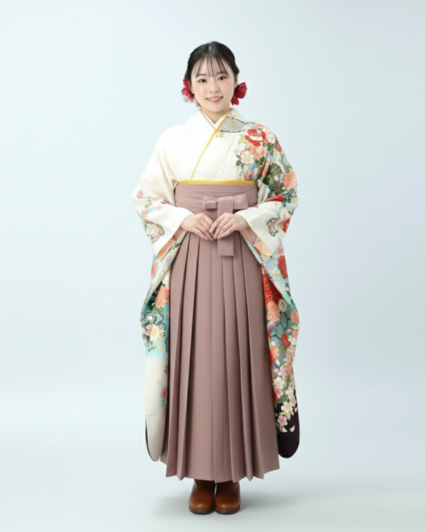 卒業式 袴 |振袖 白地 熨斗目と花々 Lサイズ・ くすみピンク袴