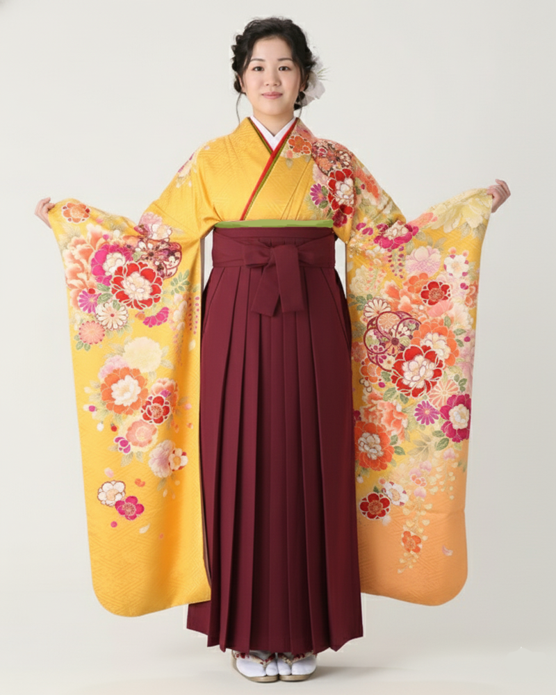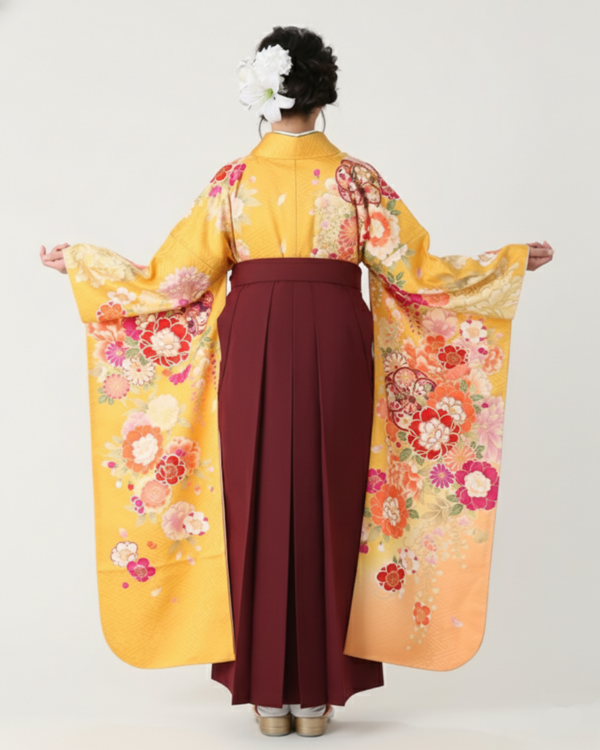 華やかな振袖を、エンジ色の袴がぐっと引き締めて、凛とした美しさを演出します。