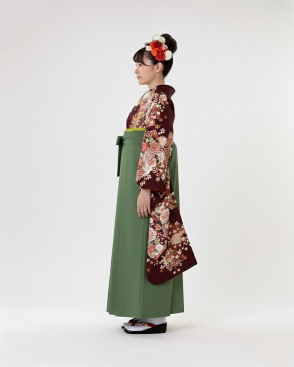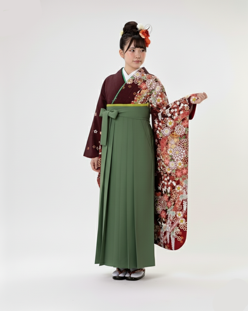 伝統的な抹茶色の袴と合わせれば、振袖の赤がより一層映え、モダンで洗練された印象に。