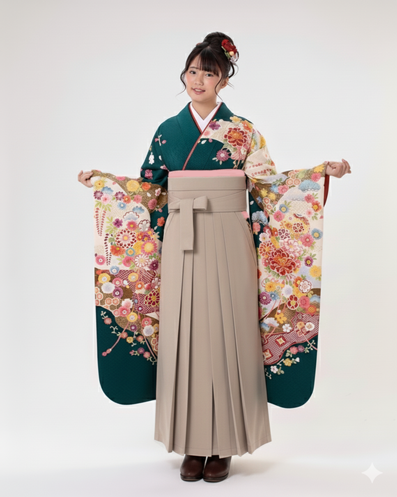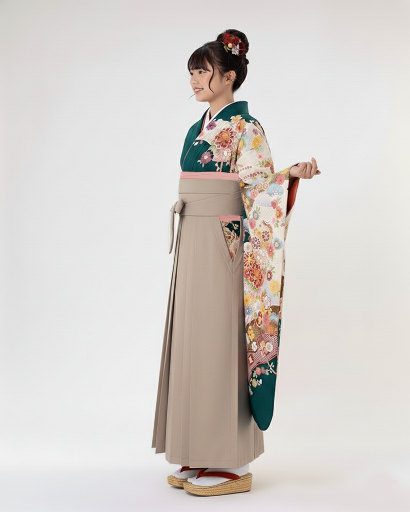 濃い目のベージュ袴が、シックながらも明るい印象を与え、大人の女性の可愛らしさを演出します。