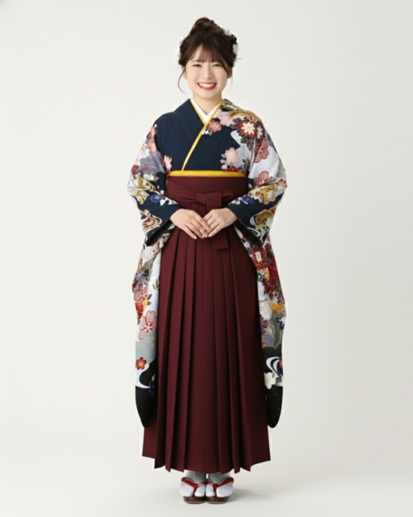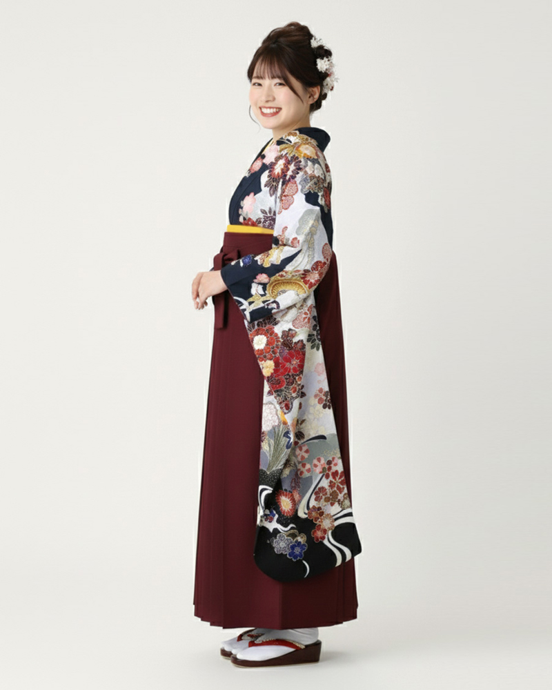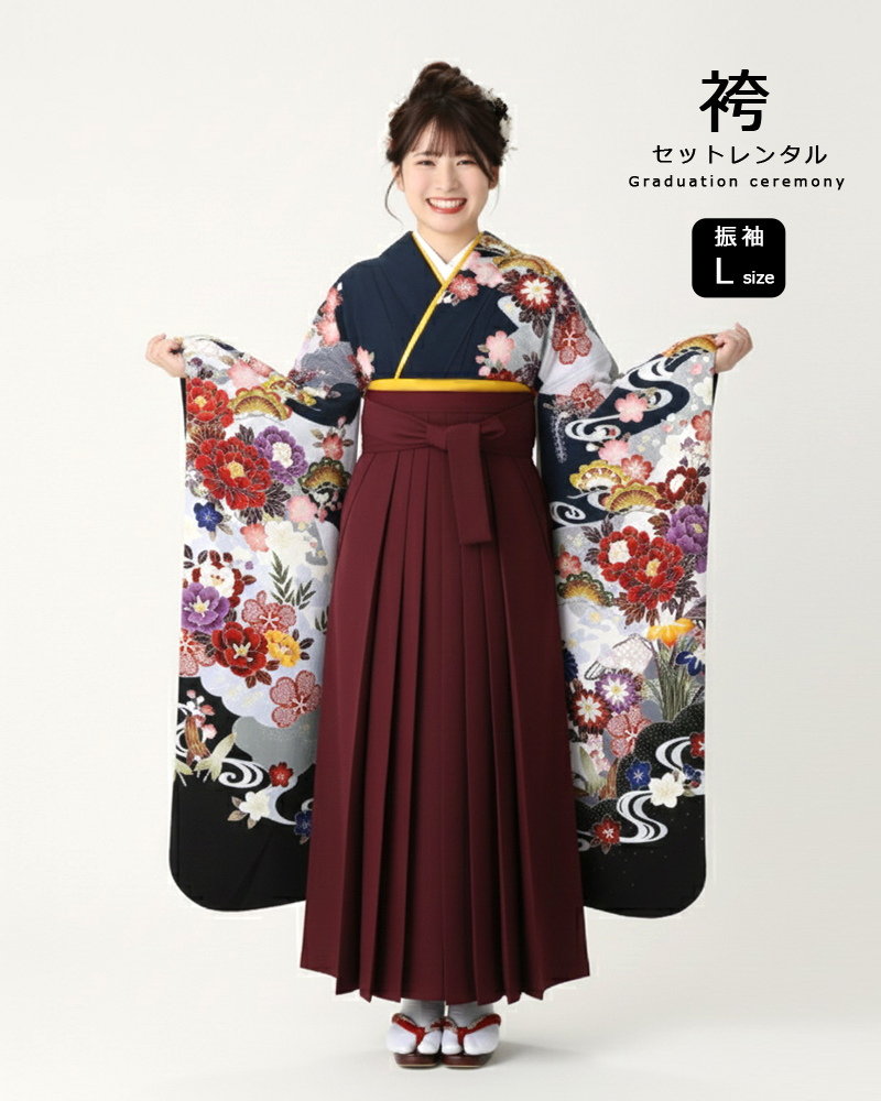 卒業式 袴 |振袖 濃紺地に大輪の牡丹や菊 Lサイズ・エンジ袴