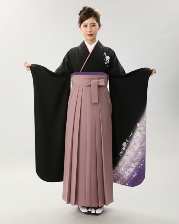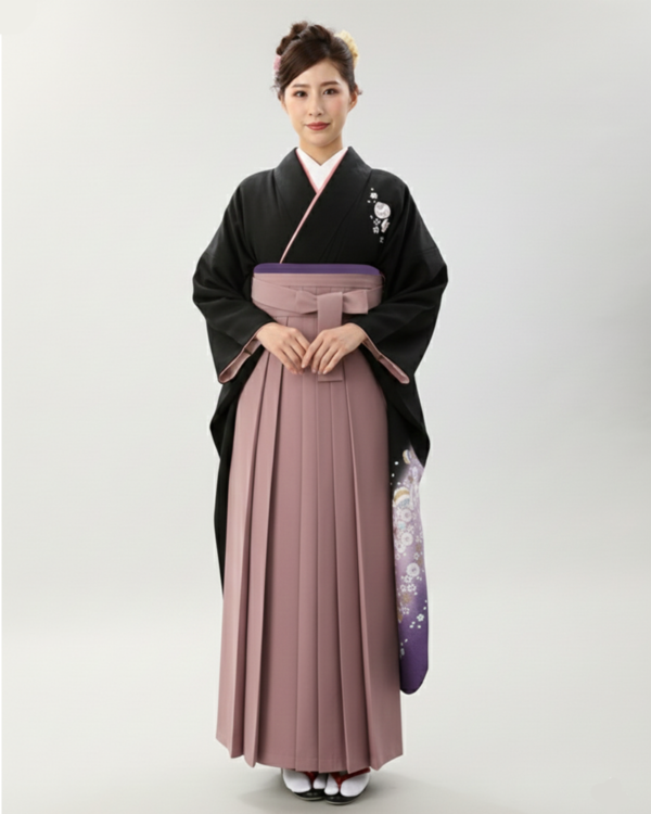 くすみピンクの愛らしい袴で黒の振袖を柔らかい印象に。