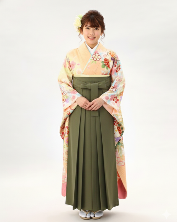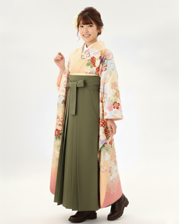 卒業式 袴 |振袖 淡いマルチカラーに桜や牡丹、宝尽くし Sサイズ・ 抹茶色袴