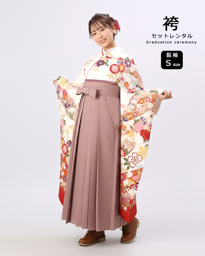 卒業式 袴 |振袖 白地に手毬と貝桶 Sサイズ・ くすみピンク袴
