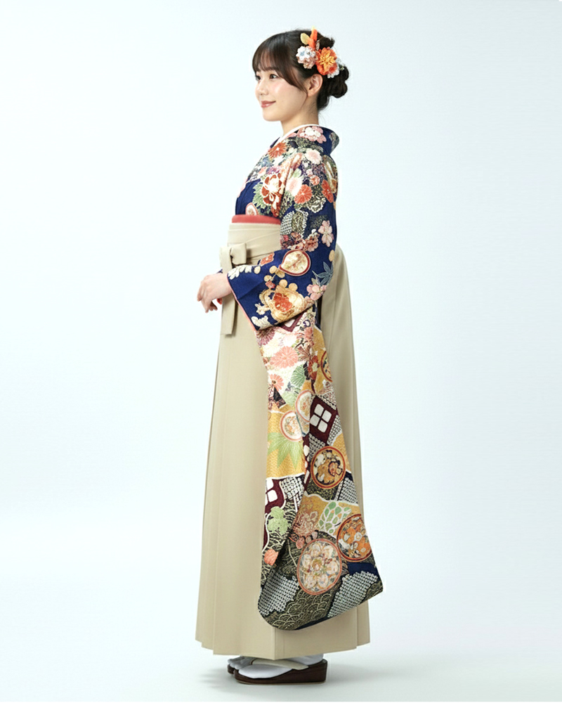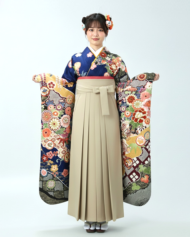 卒業式 袴 |振袖 紺地に豪華な古典文様 Lサイズ・アイボリー袴