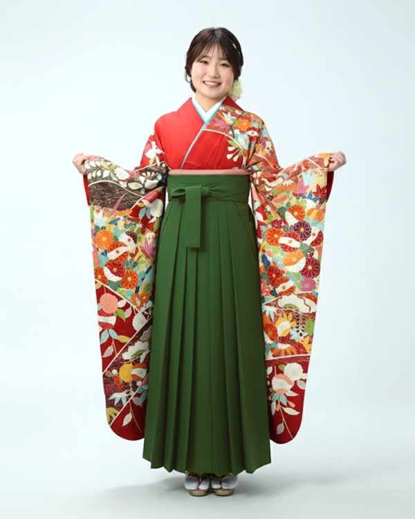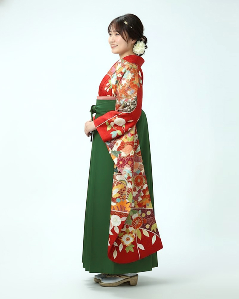着物の華やかさを引き立てる、落ち着いた抹茶色の袴が立ち姿をすらりと見せてくれます。