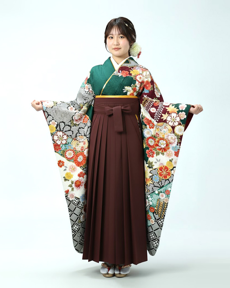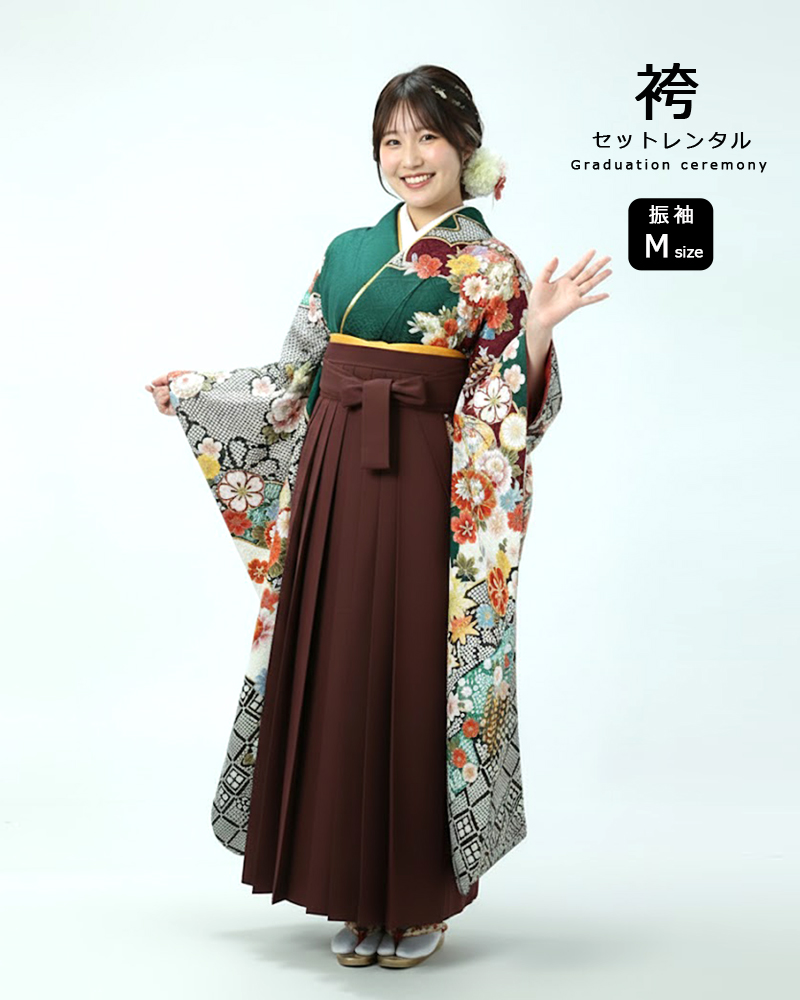 卒業式 袴 |振袖 深緑地に鞠と四季花 Mサイズ・ エンジ袴