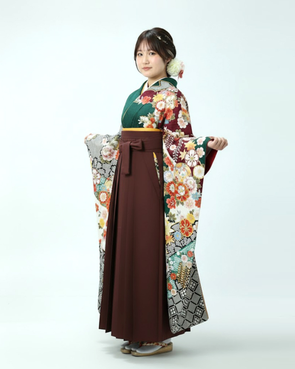 エンジ色の袴と合わせれば、統一感があり、モダンで洗練された印象に。
