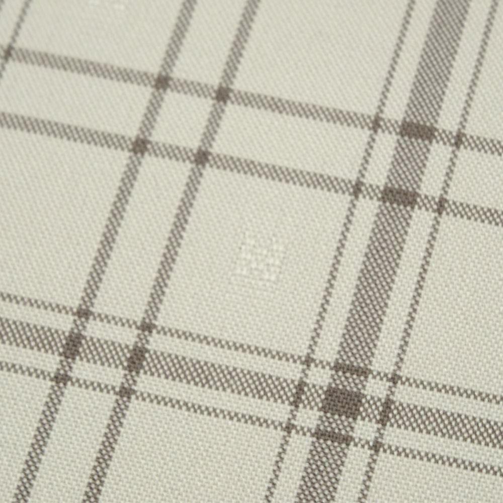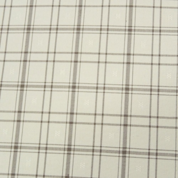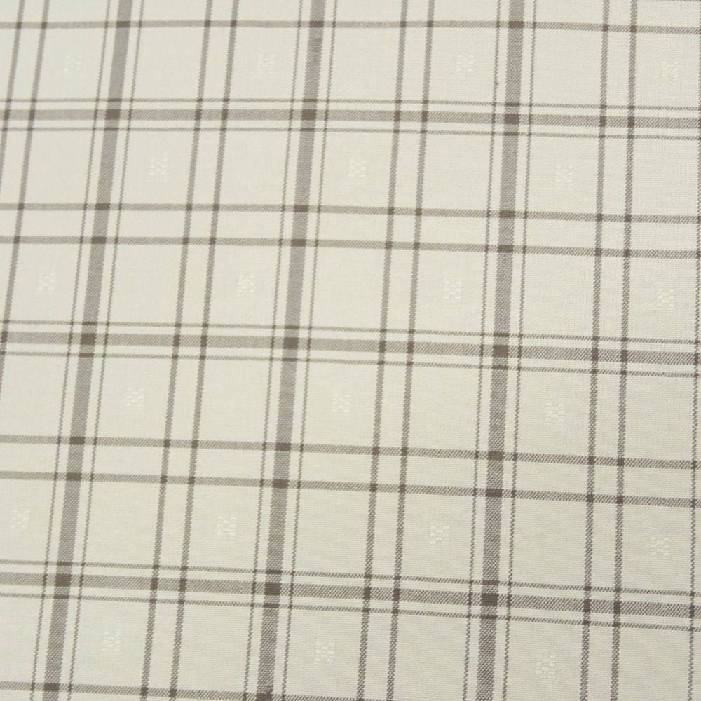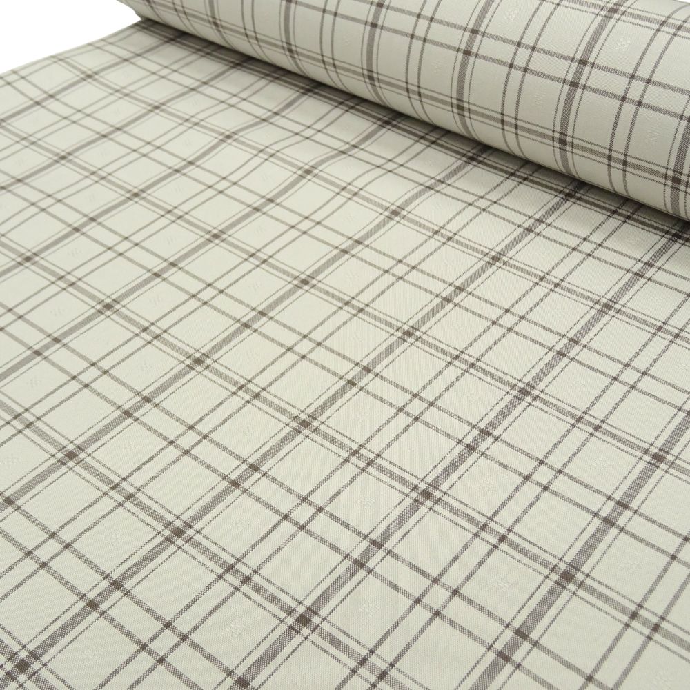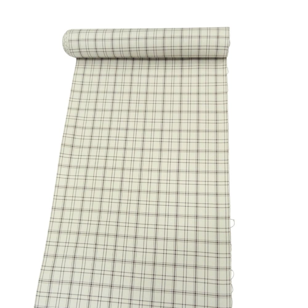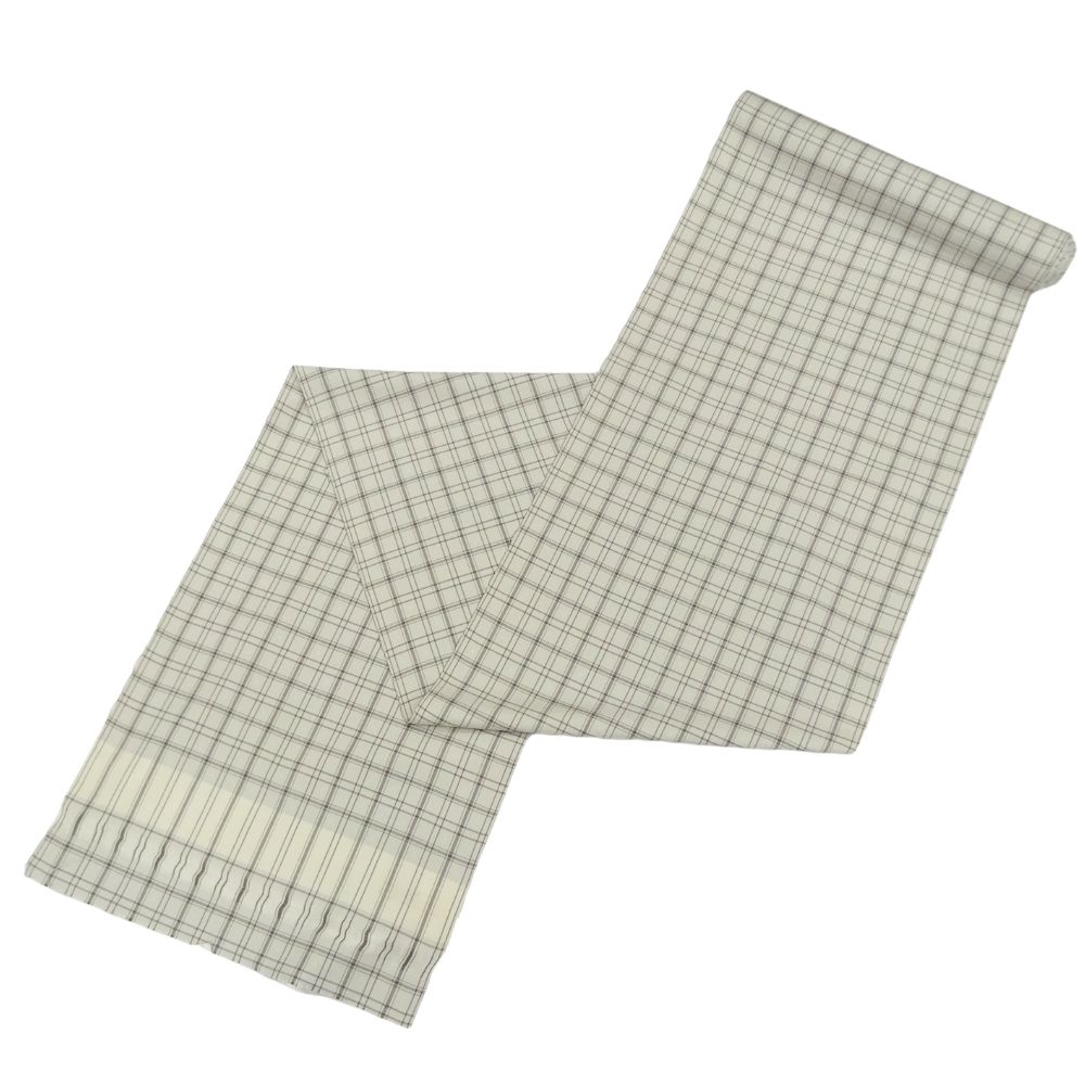 爽やかな白地に、ベージュとグレーのラインで構成された格子柄がモダンな印象を与える、正絹の紬反物です。 一見シンプルな格子柄ですが、よく見ると地紋のように小さな四角い「浮き織」がランダムに配されており、光の加減で繊細な表情を見せる非常に手の込んだ織り地となっています。