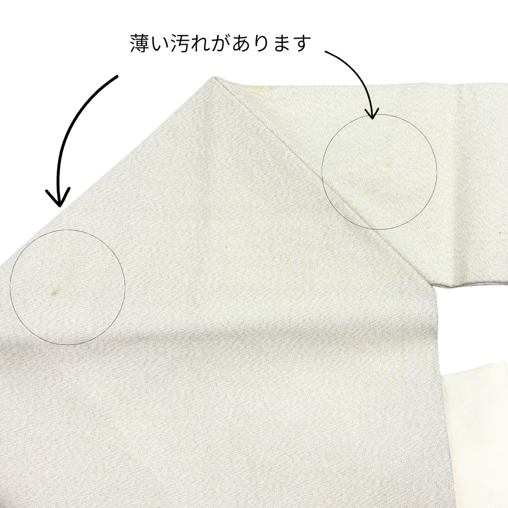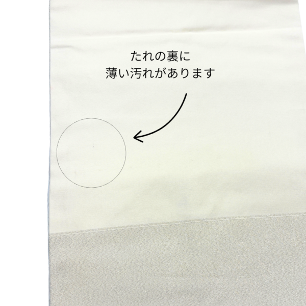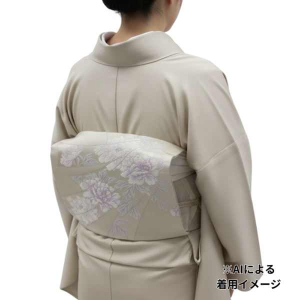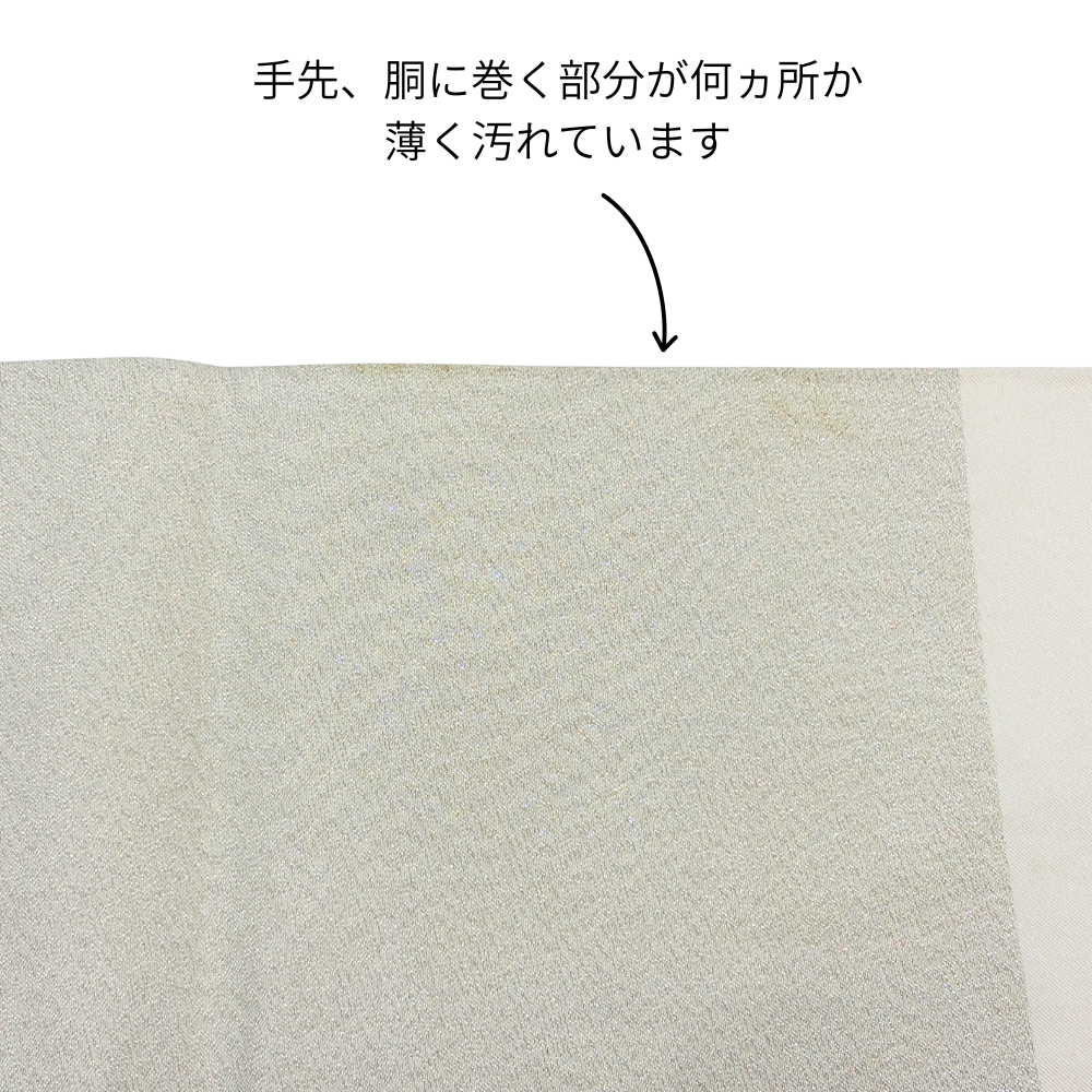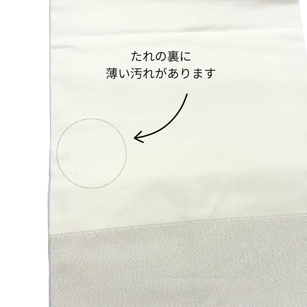 帯地全体は、ごく淡いクリーム色の上品で繊細な色合いで、銀糸が織り込まれているため、光を受けて上品に輝き、礼装としての格調を高めています。