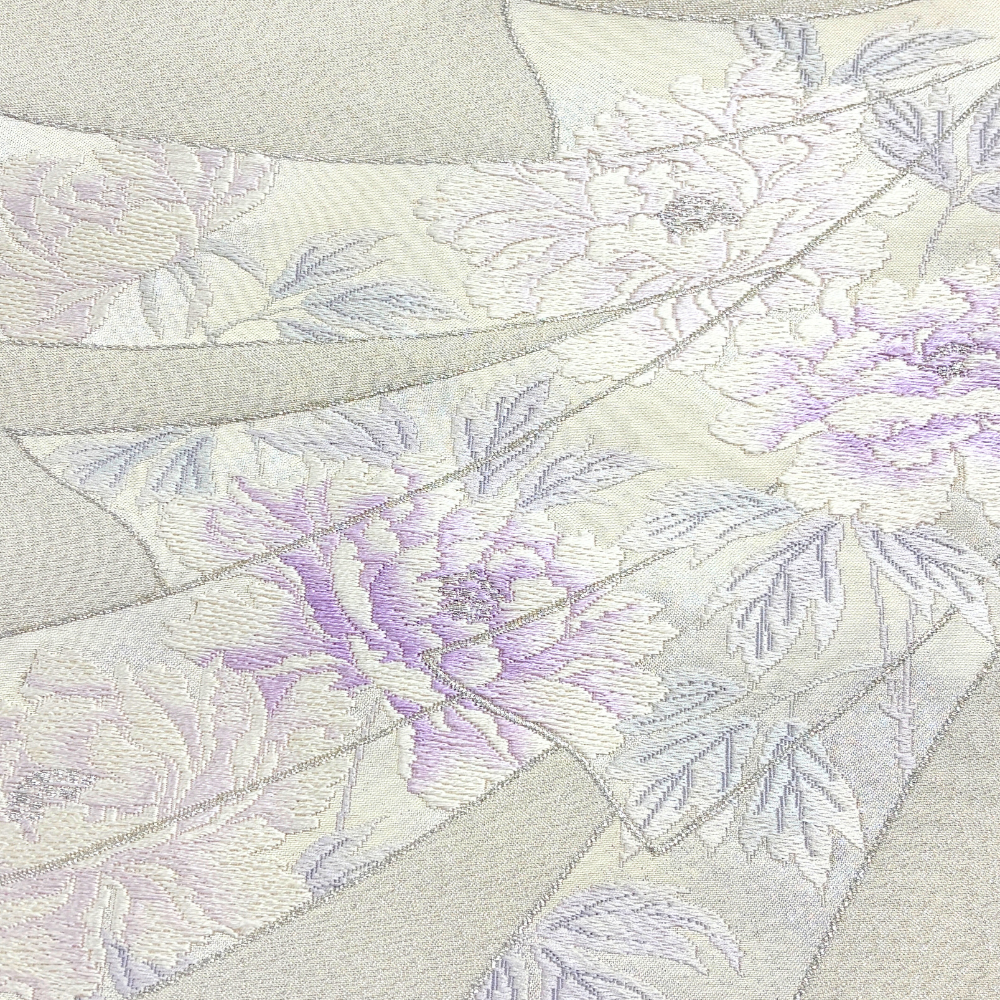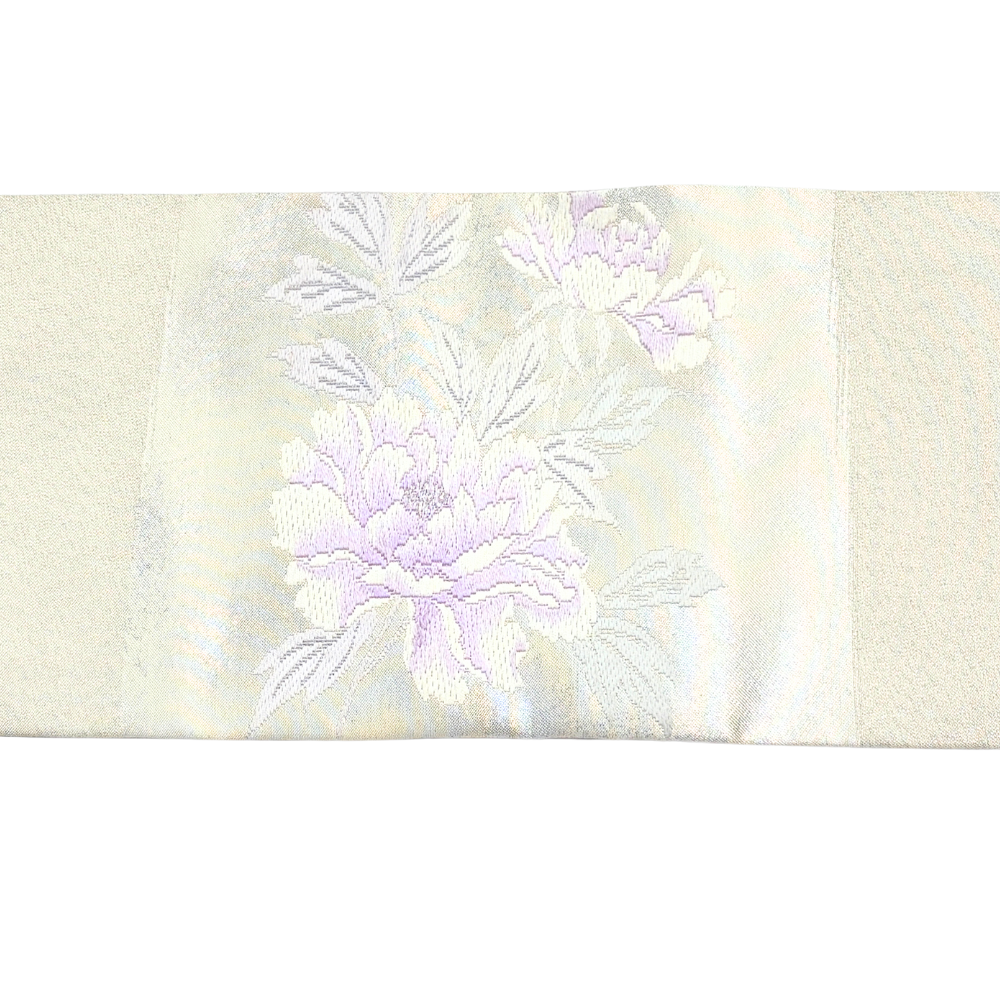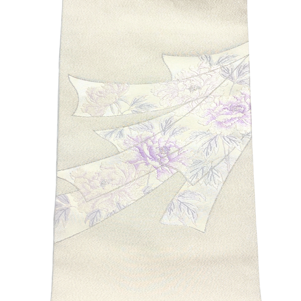礼装用名古屋帯 正絹 リユース 中古 クリーム×シルバー 牡丹と熨斗目 k-10-005-2(8050-00611)