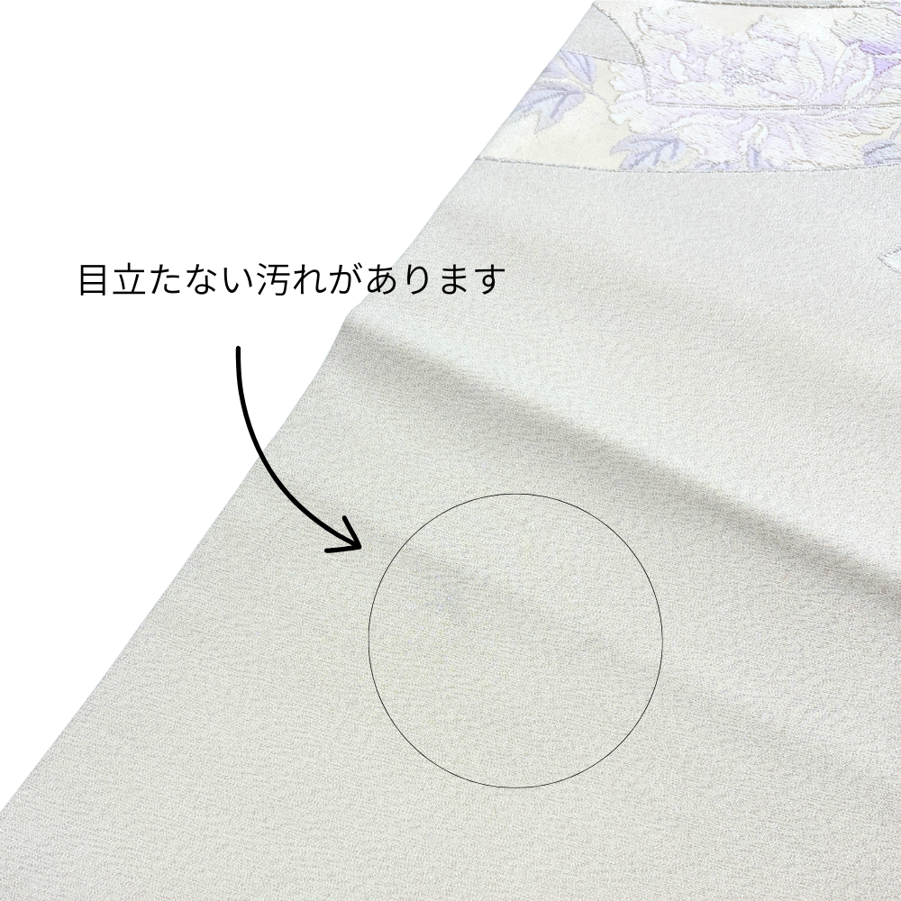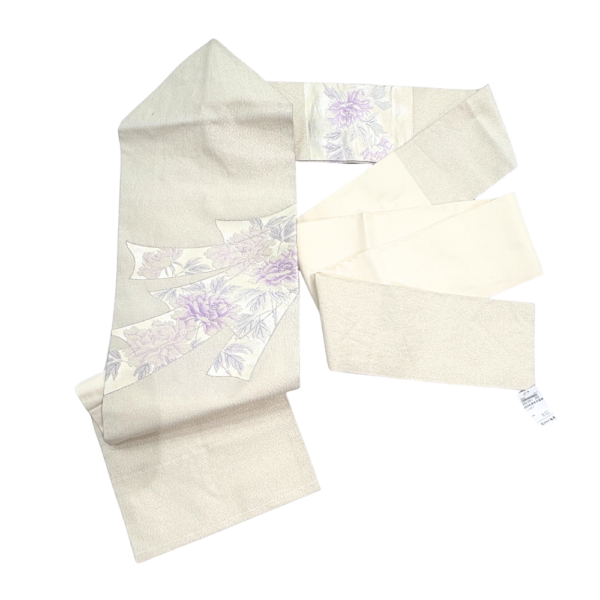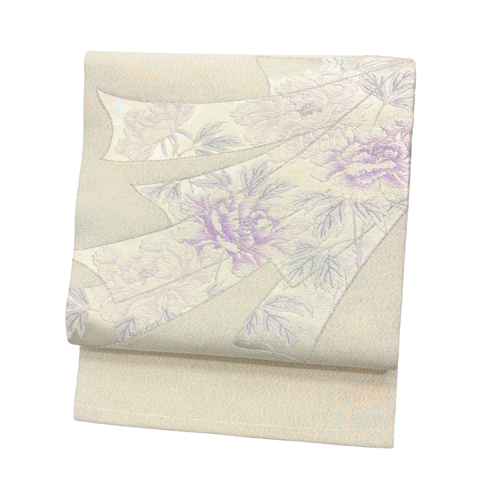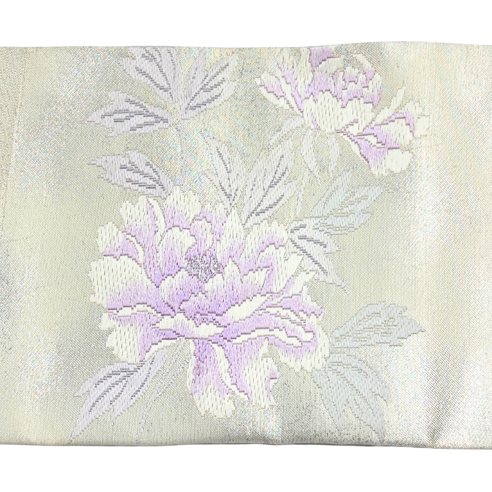 礼装用名古屋帯 正絹 リユース 中古 クリーム×シルバー 牡丹と熨斗目 k-10-005-2(8050-00611)