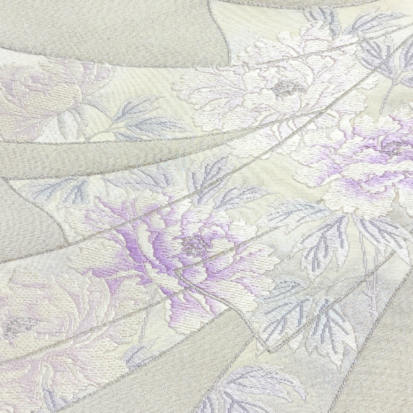 淡い藤色や薄紫色、そして白や銀の糸で、ふっくらと豪華に織り出されており、非常に格調高く、エレガントな雰囲気を醸し出しています。