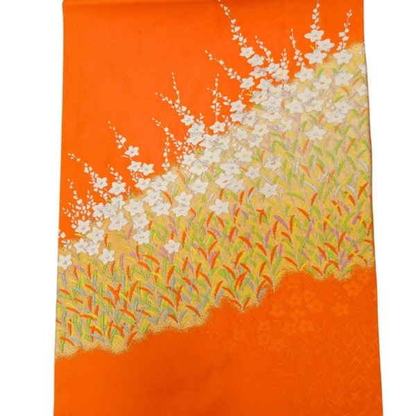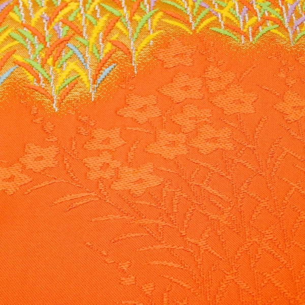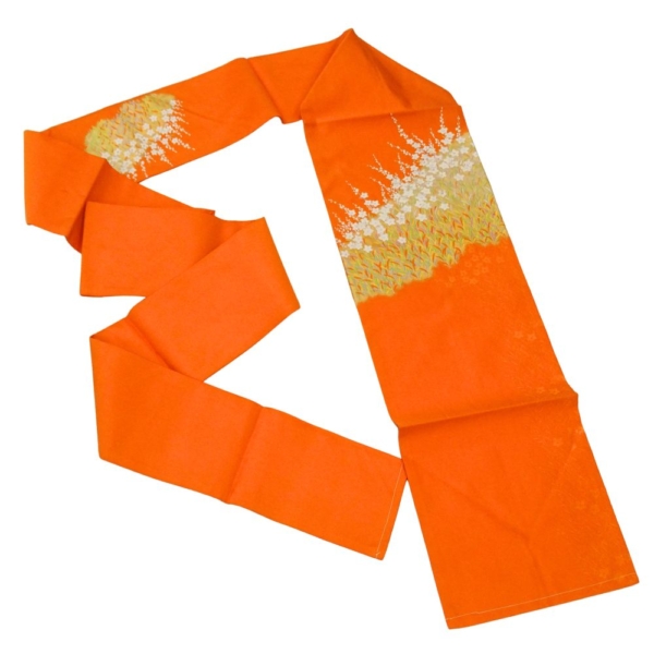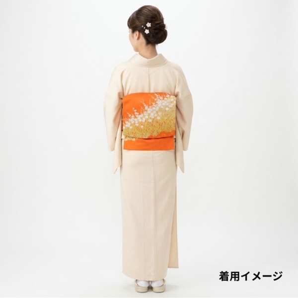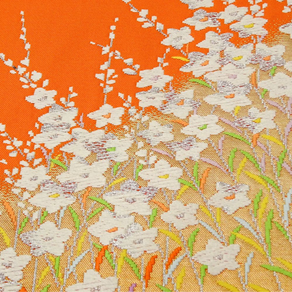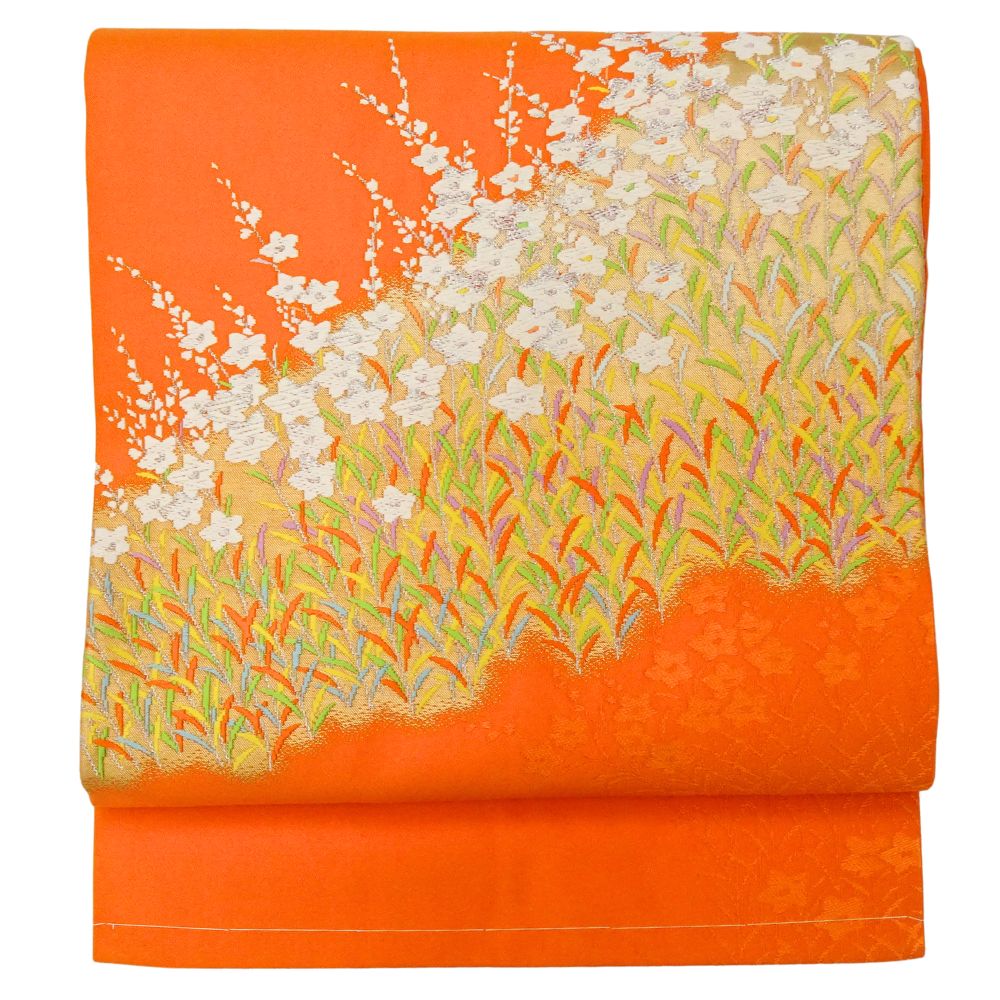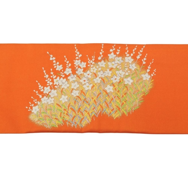 元気がもらえるような鮮やかなオレンジ色の地に、白く清らかな花々が美しく描かれた、存在感抜群の名古屋帯です。